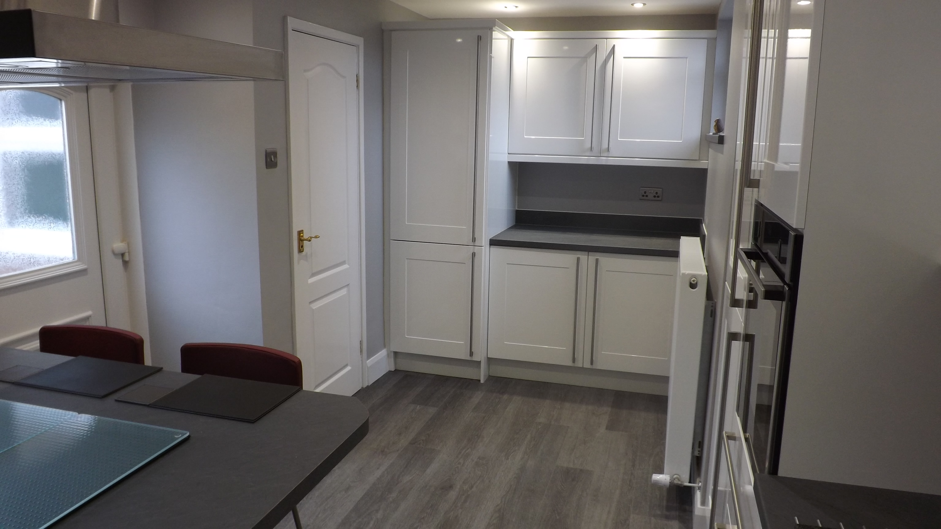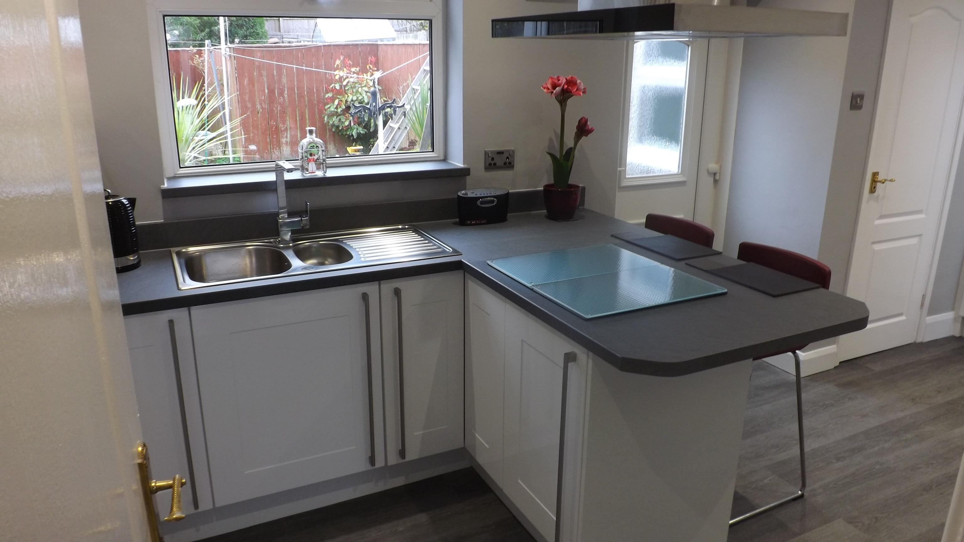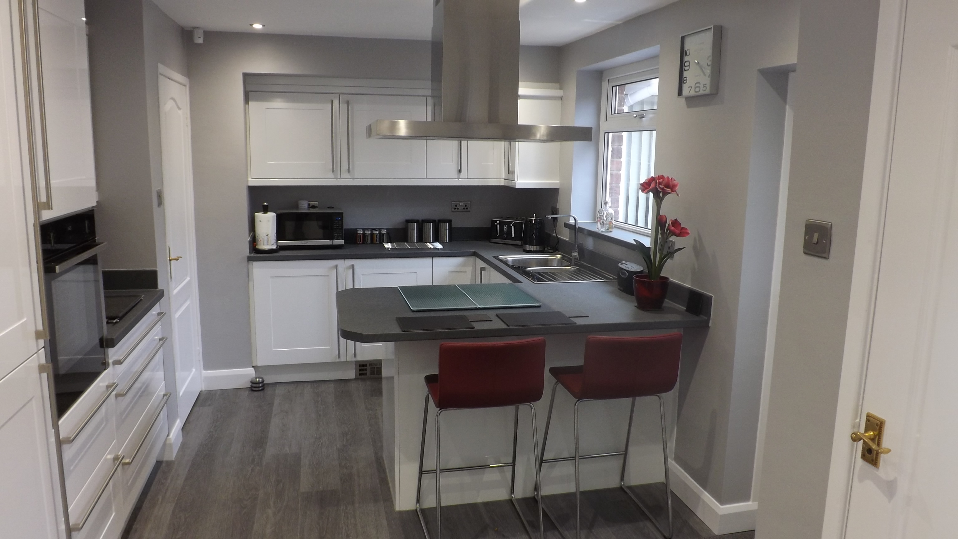 With slate effect worktops, grey woodgrain click-vinyl flooring, and ceiling mounted extractor.
