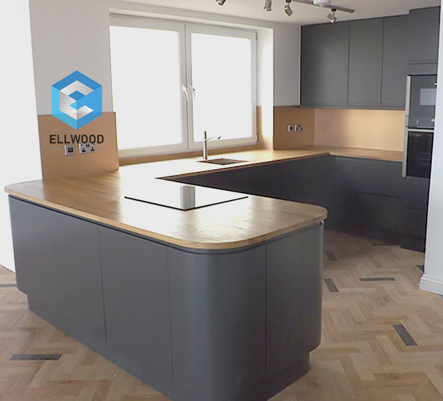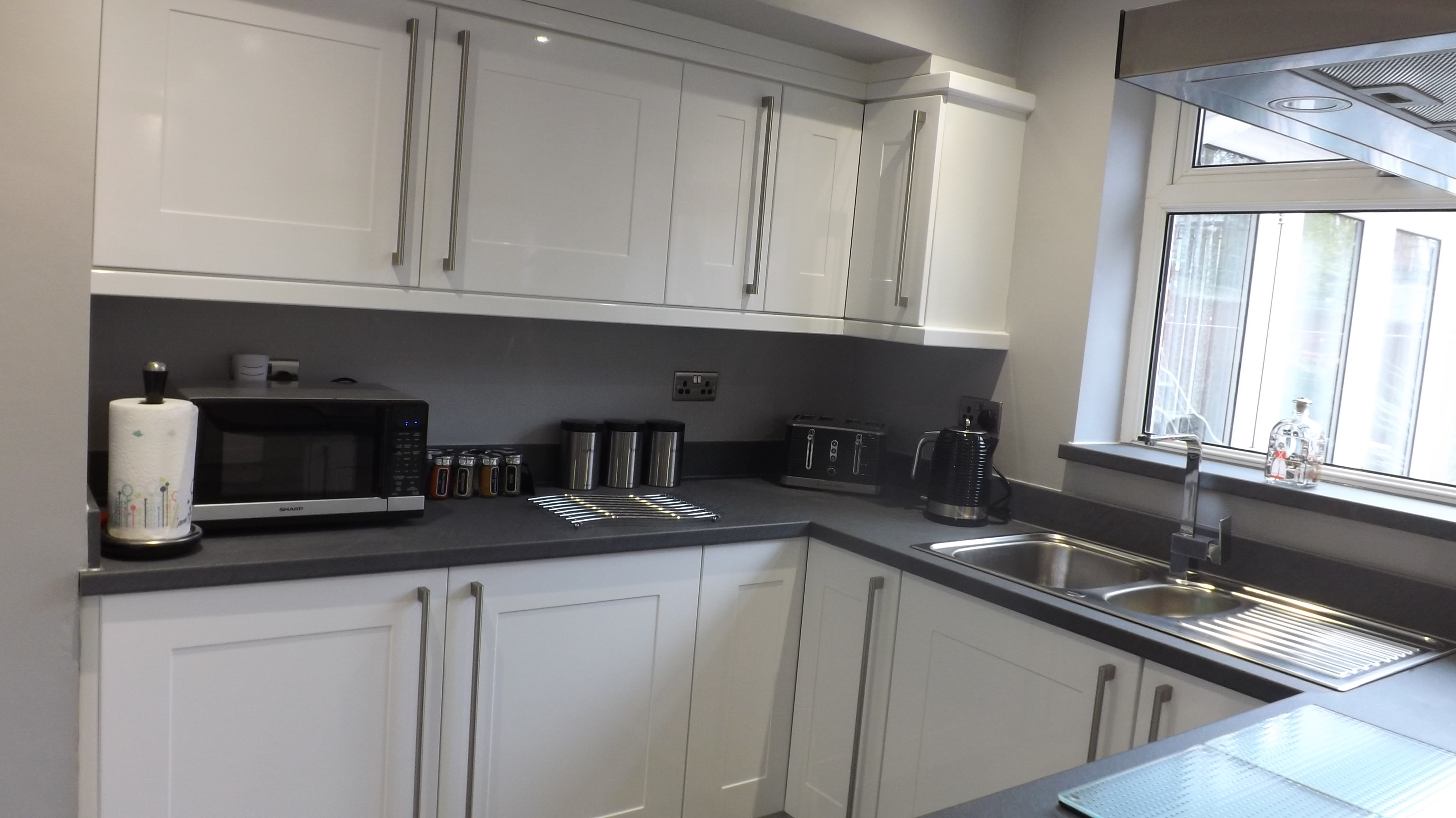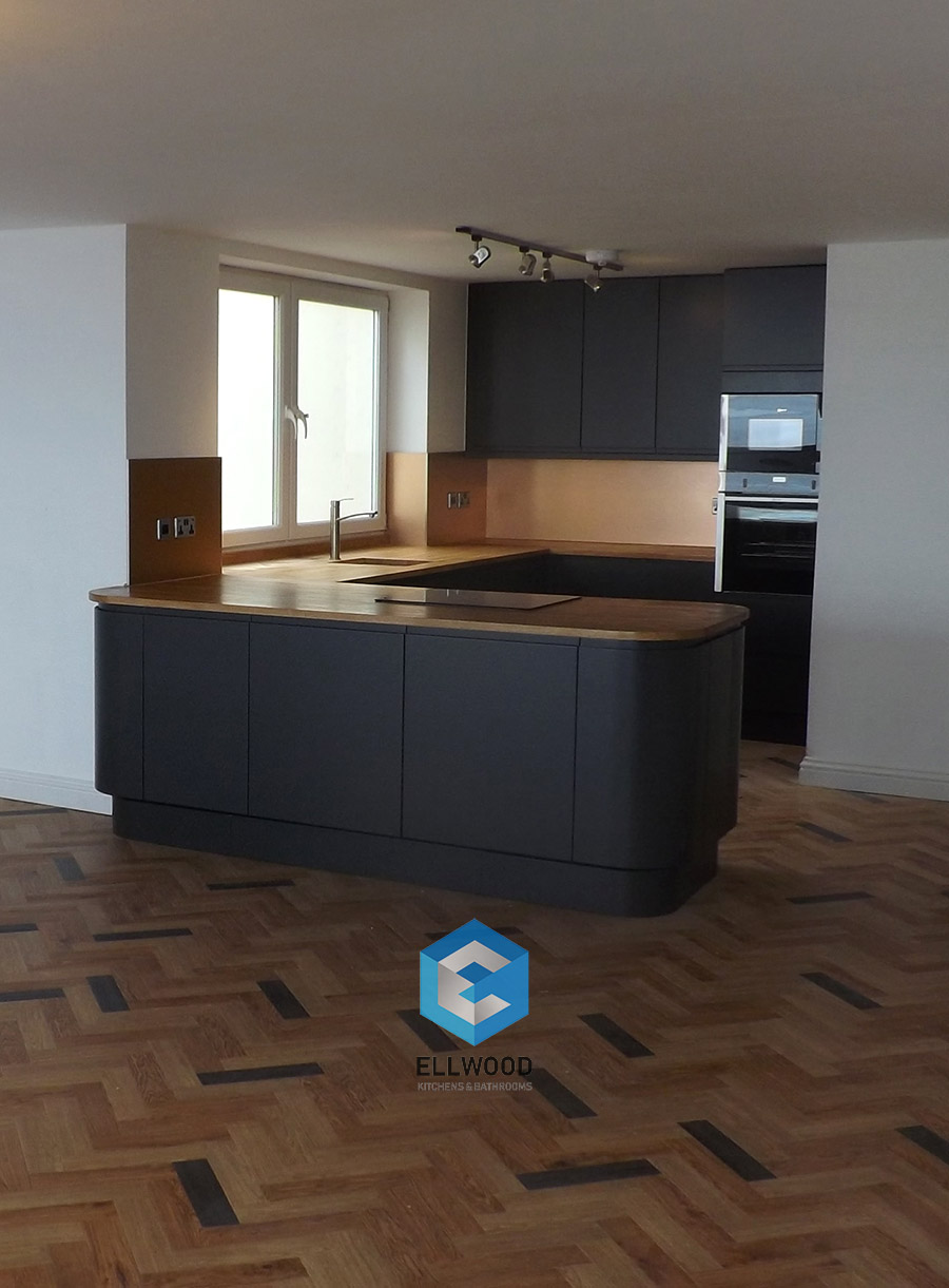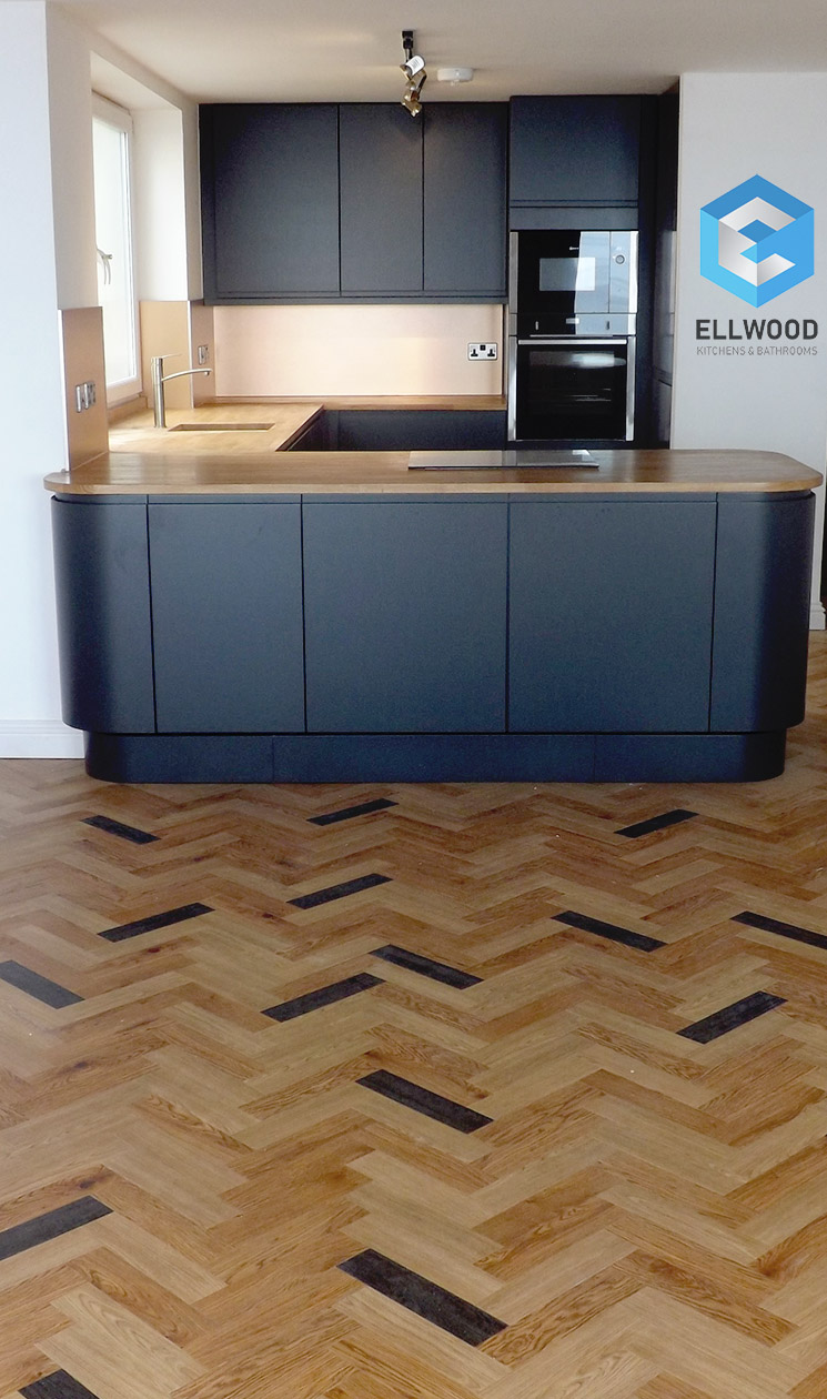 With slate effect worktops, grey woodgrain click-vinyl flooring, and ceiling mounted extractor.