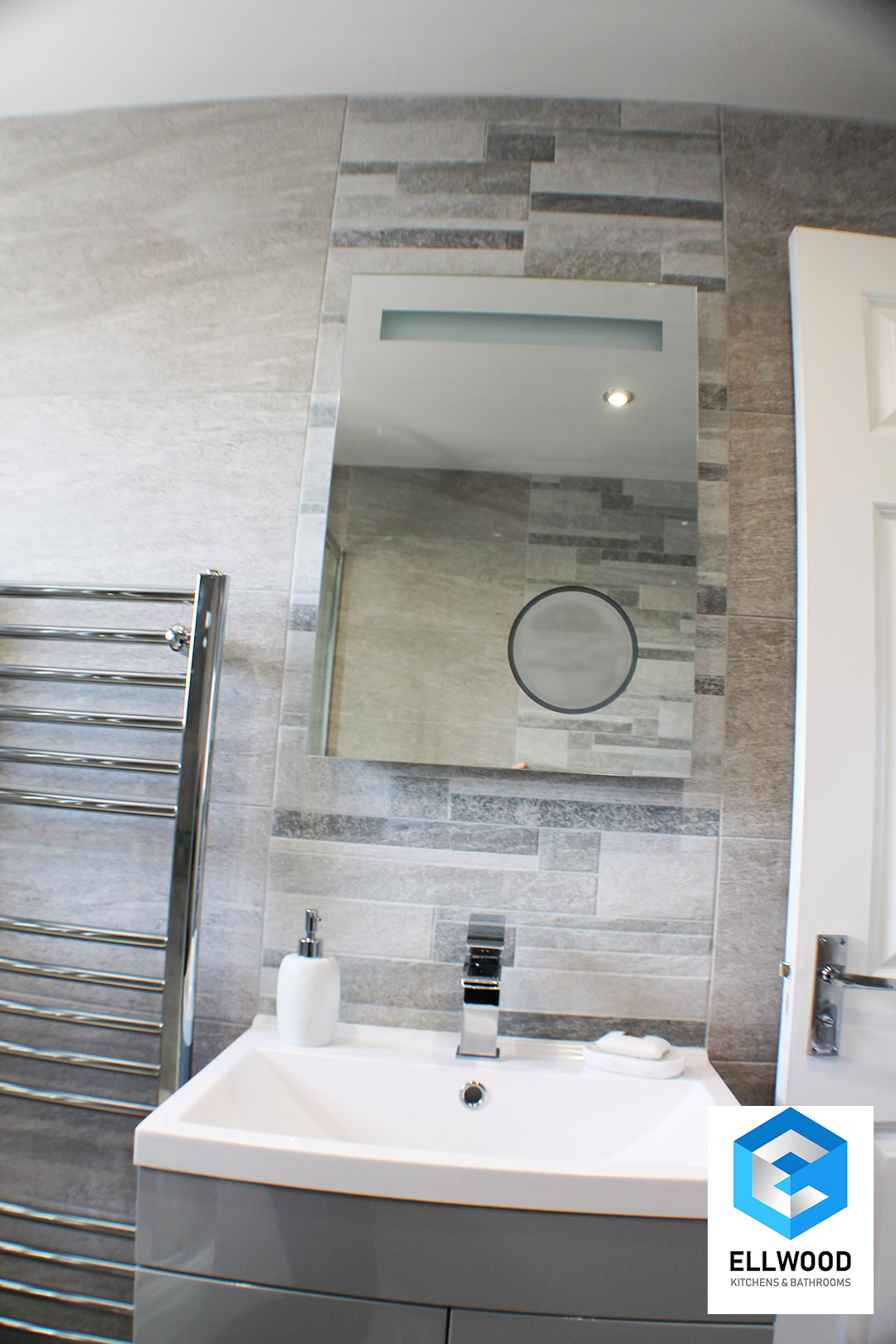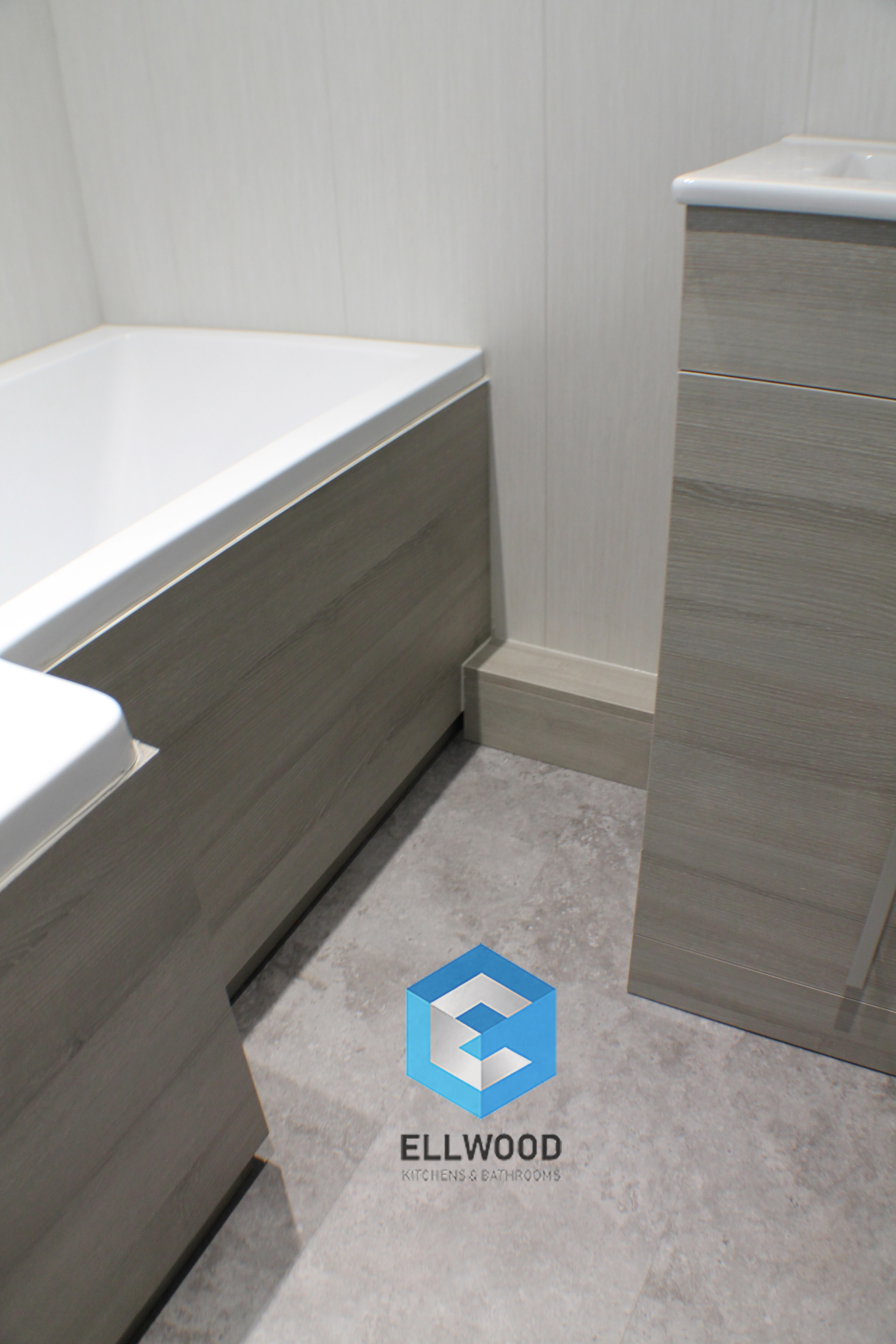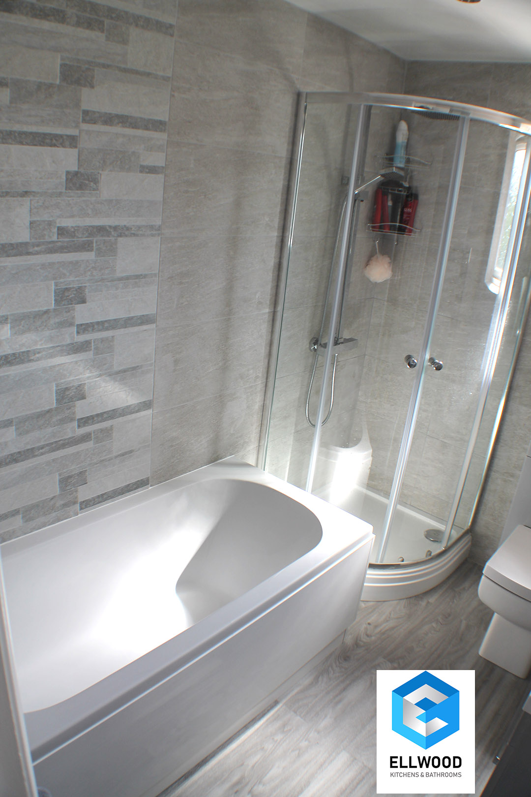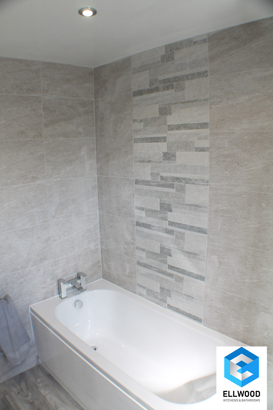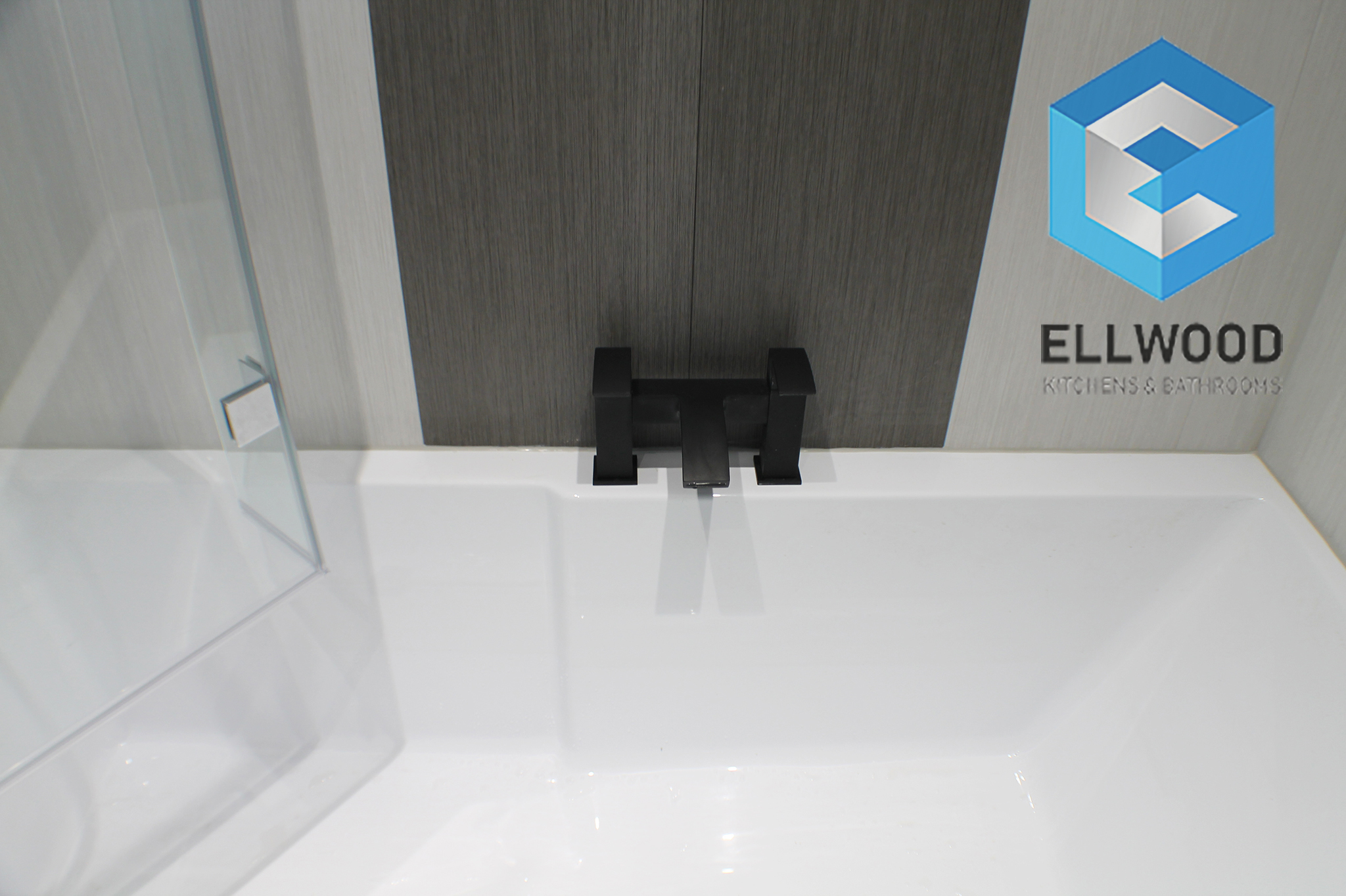 Featuring Platinum & Grey Abstract Cladding, L-Shaped Bath, Grey Ash Units & Contrasting Black Taps & Shower
