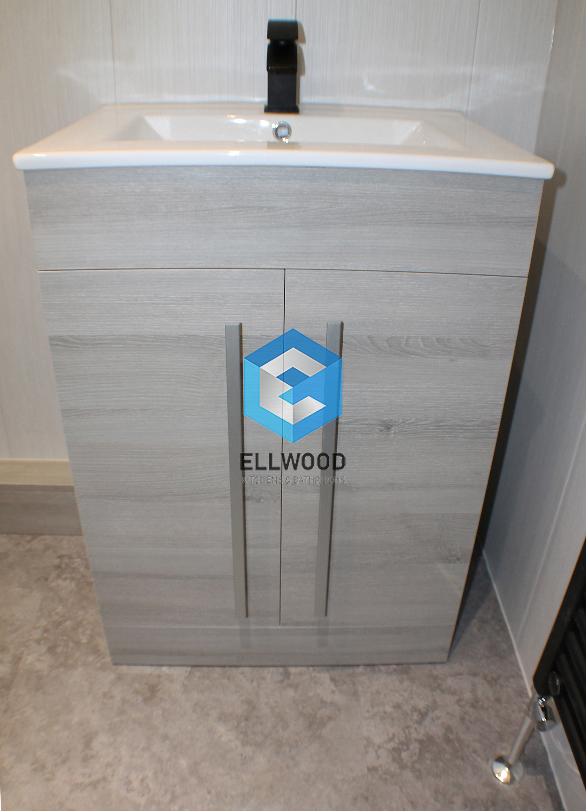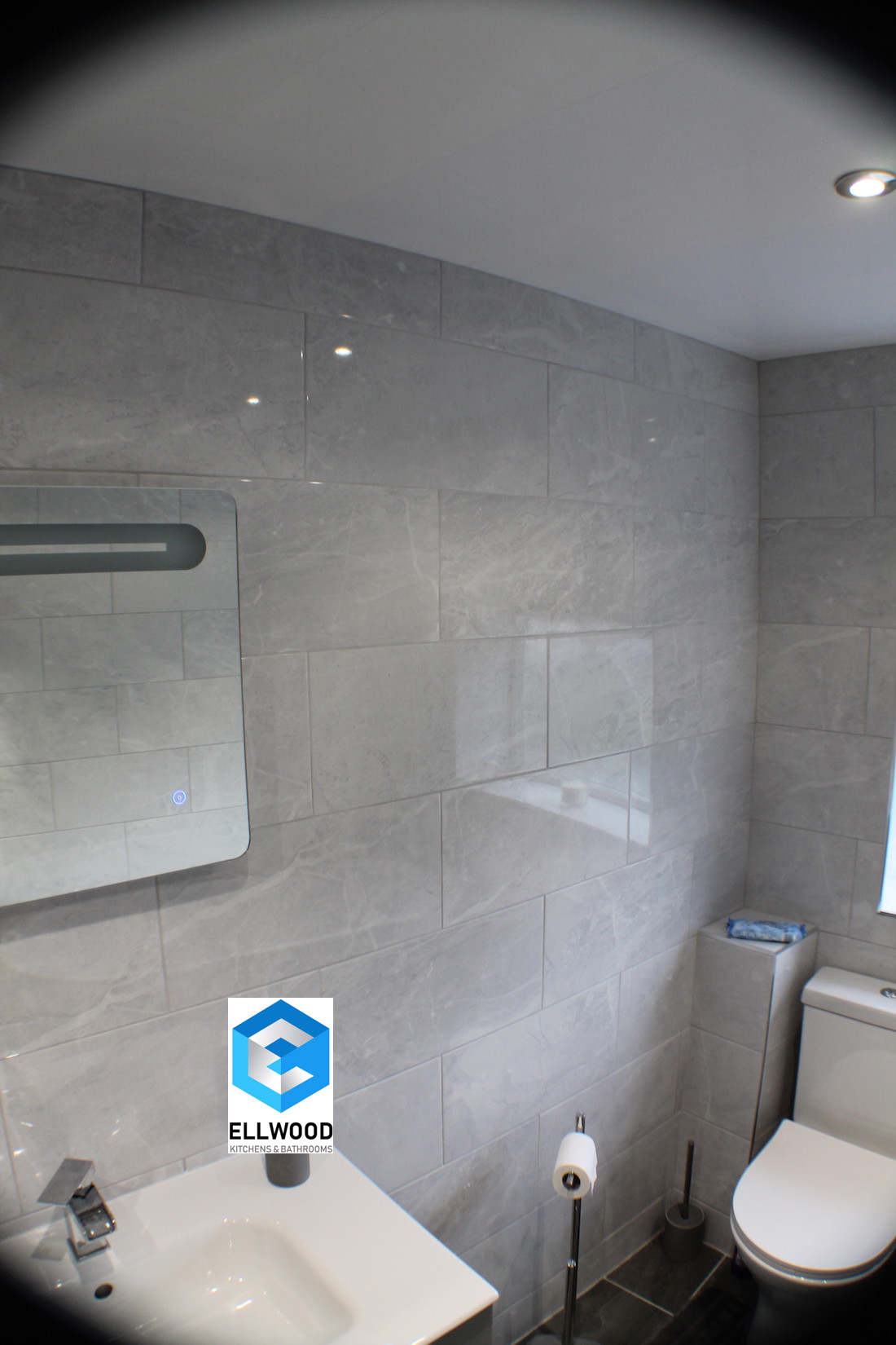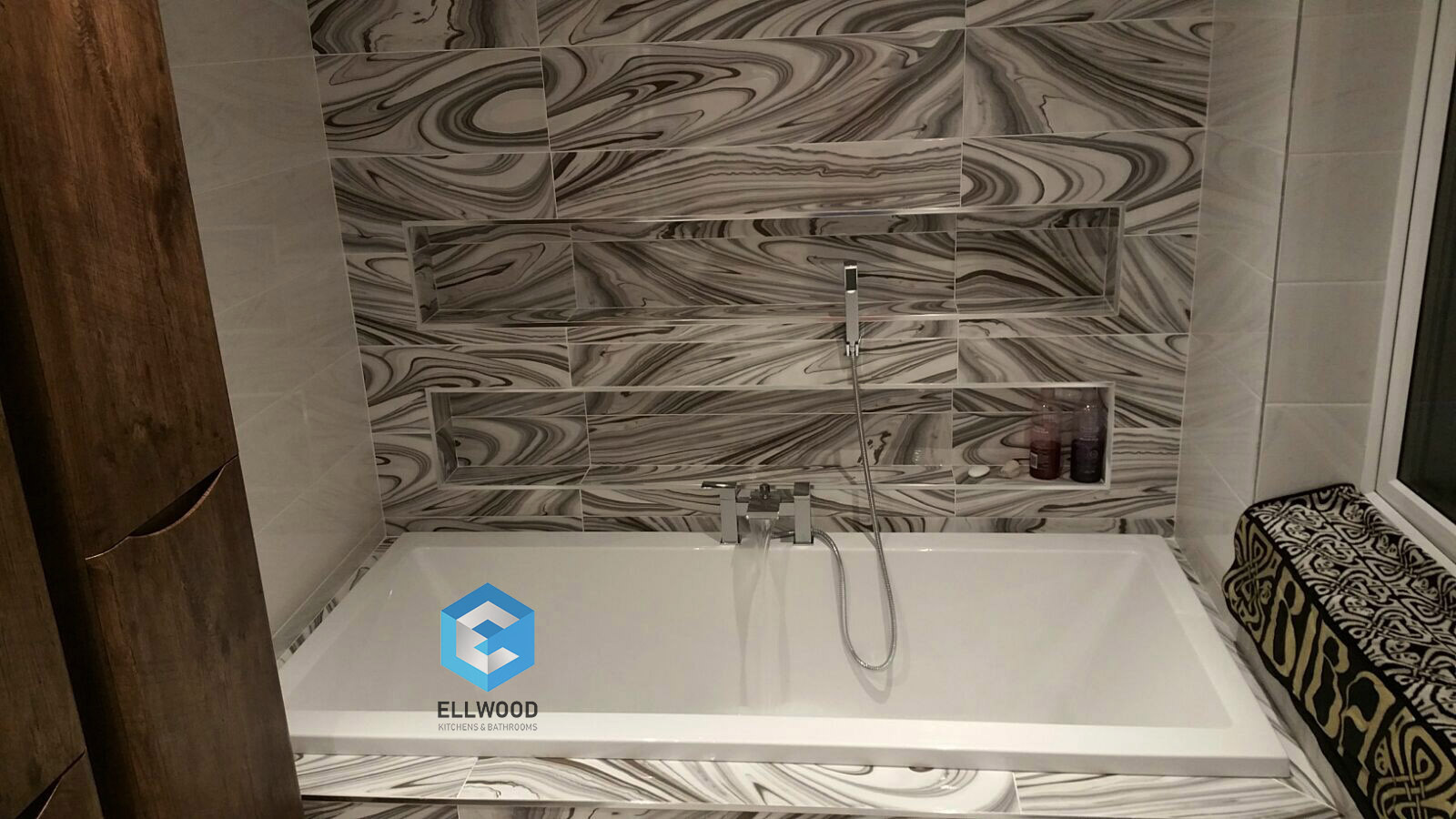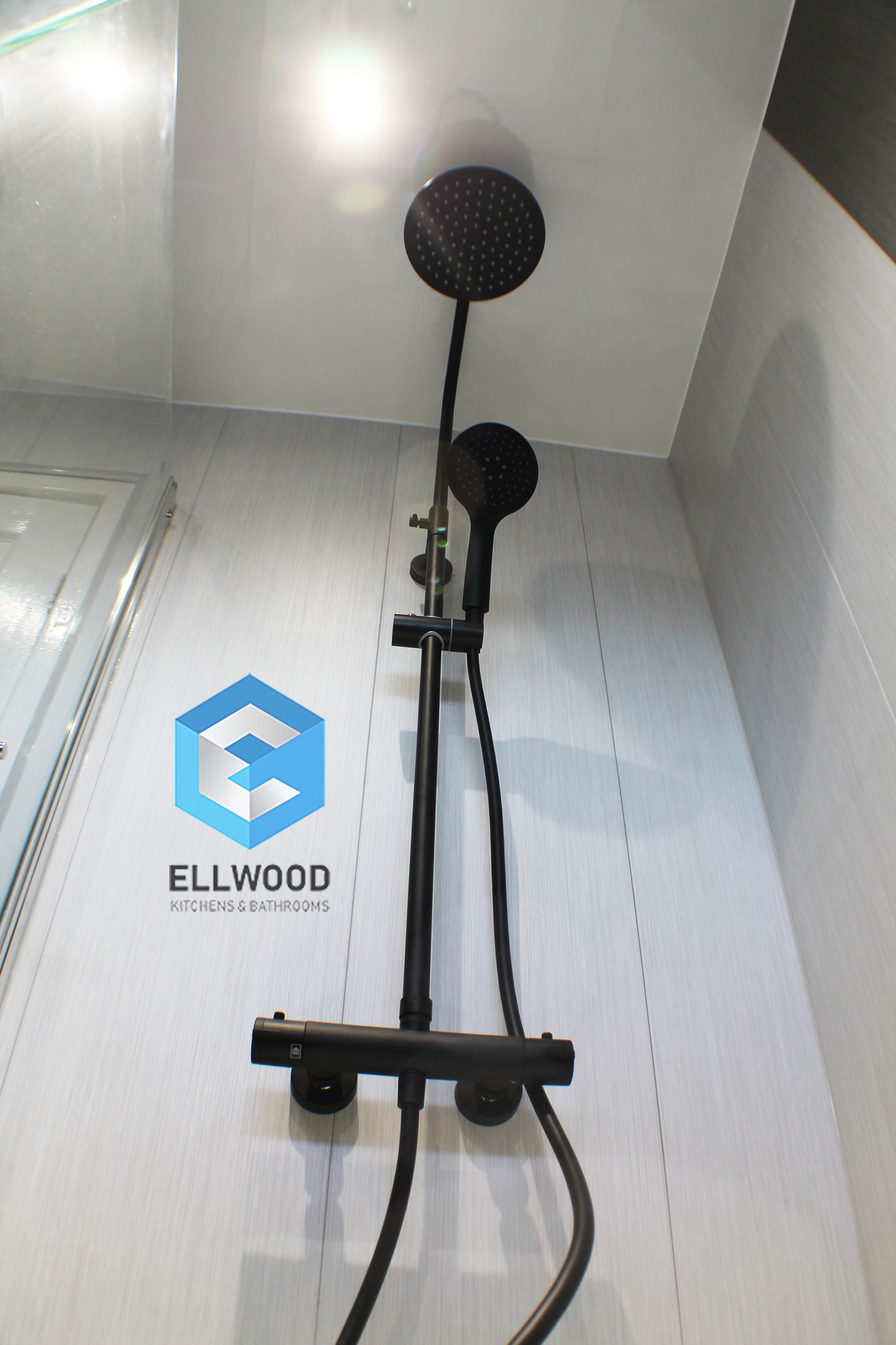 Featuring Platinum & Grey Abstract Cladding, L-Shaped Bath, Grey Ash Units & Contrasting Black Taps & Shower