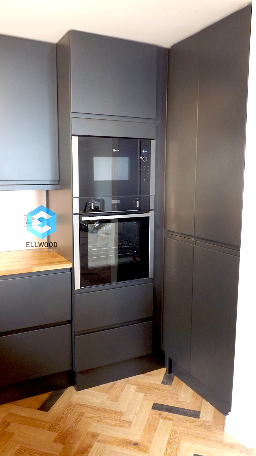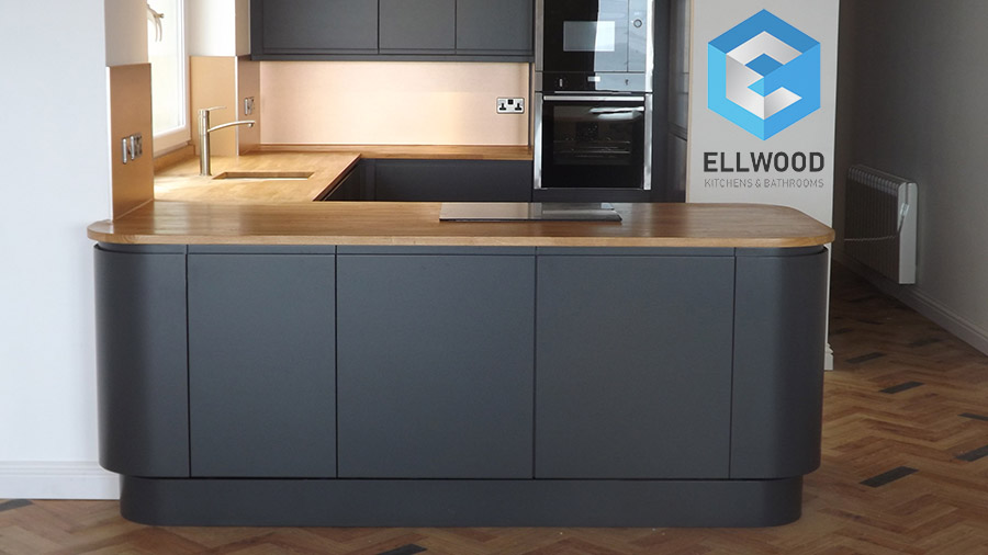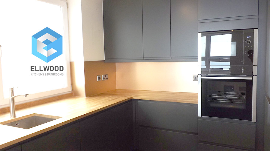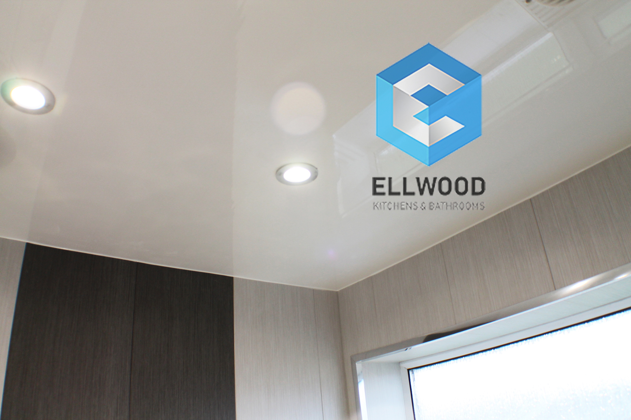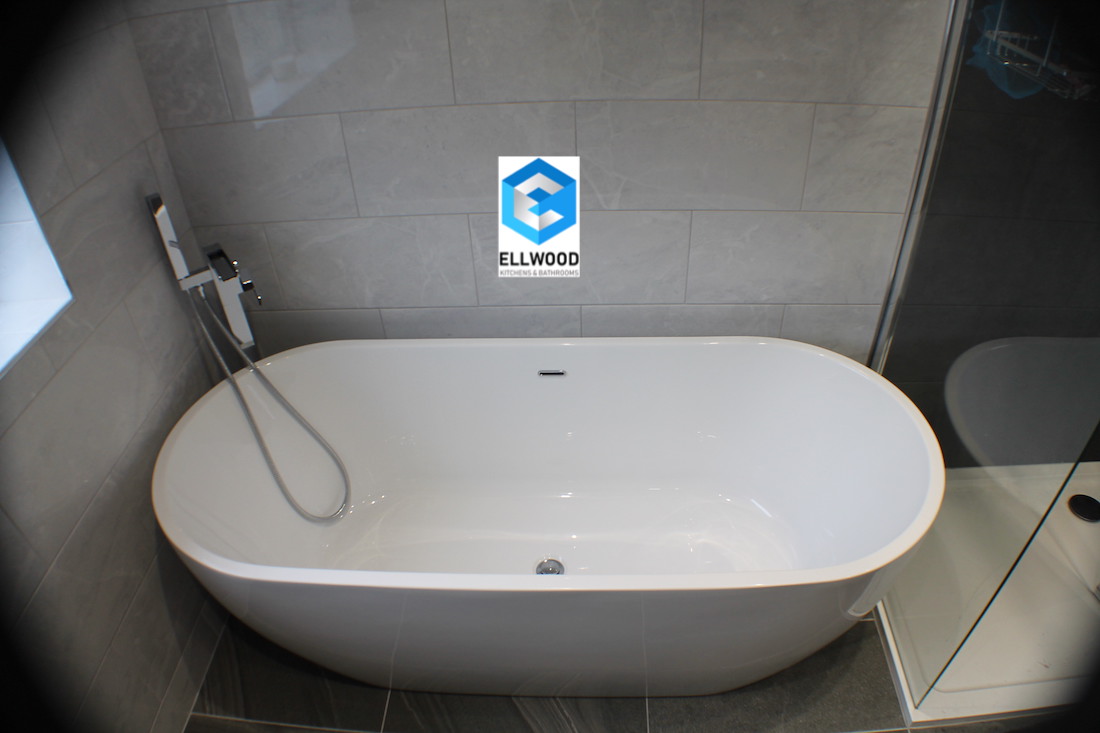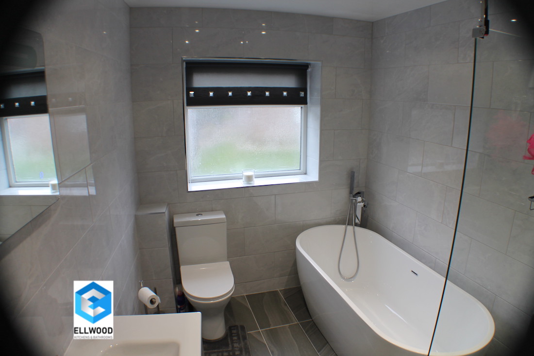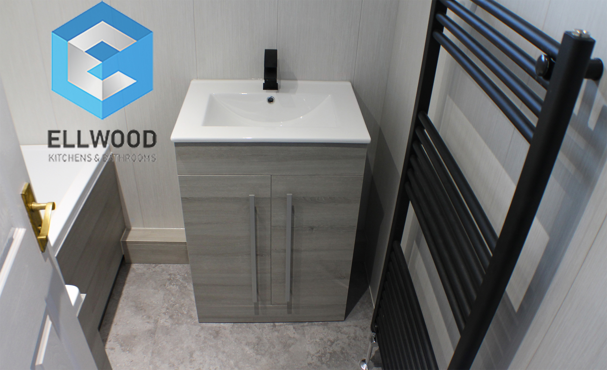 Featuring Platinum & Grey Abstract Cladding, L-Shaped Bath, Grey Ash Units & Contrasting Black Taps & Shower
