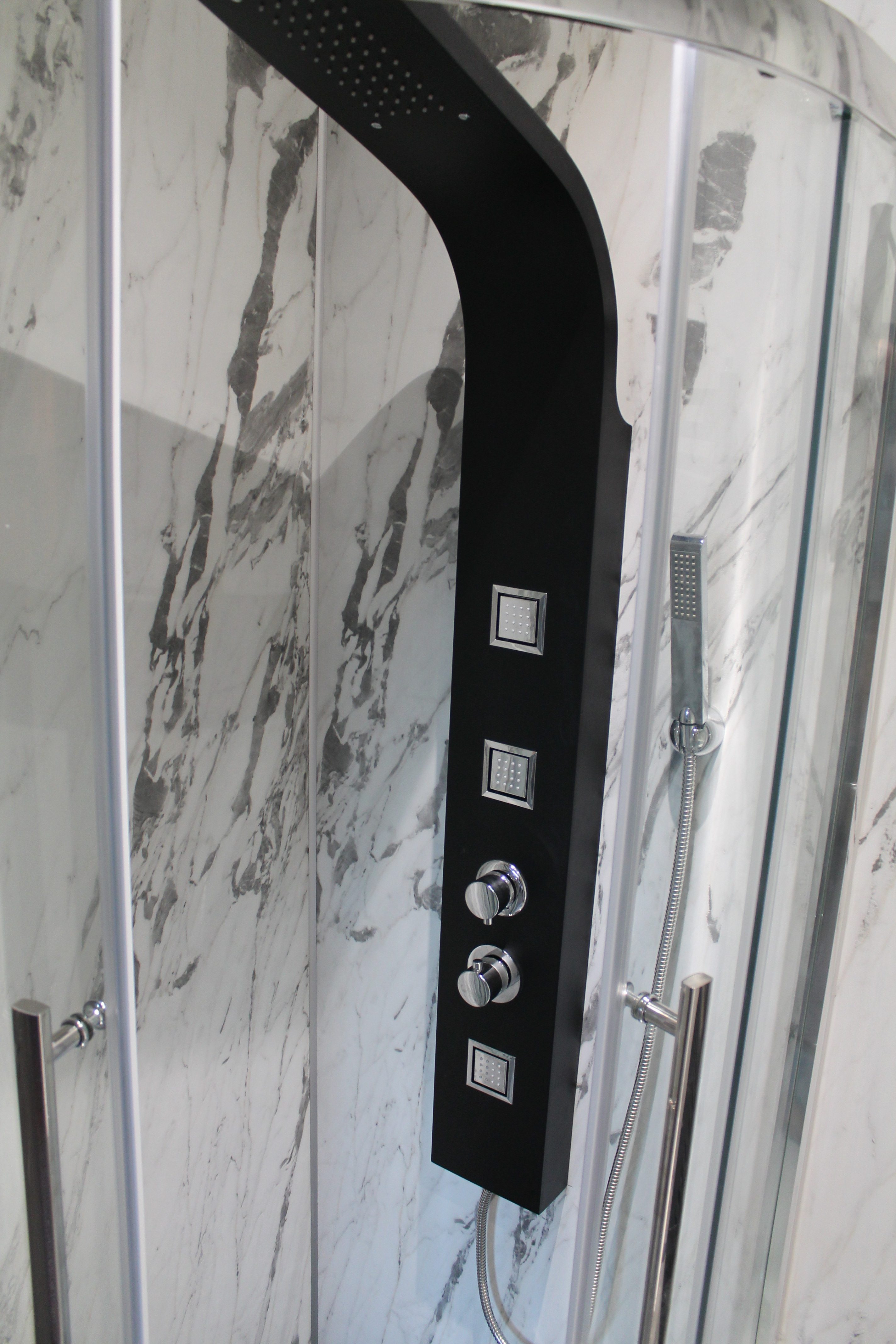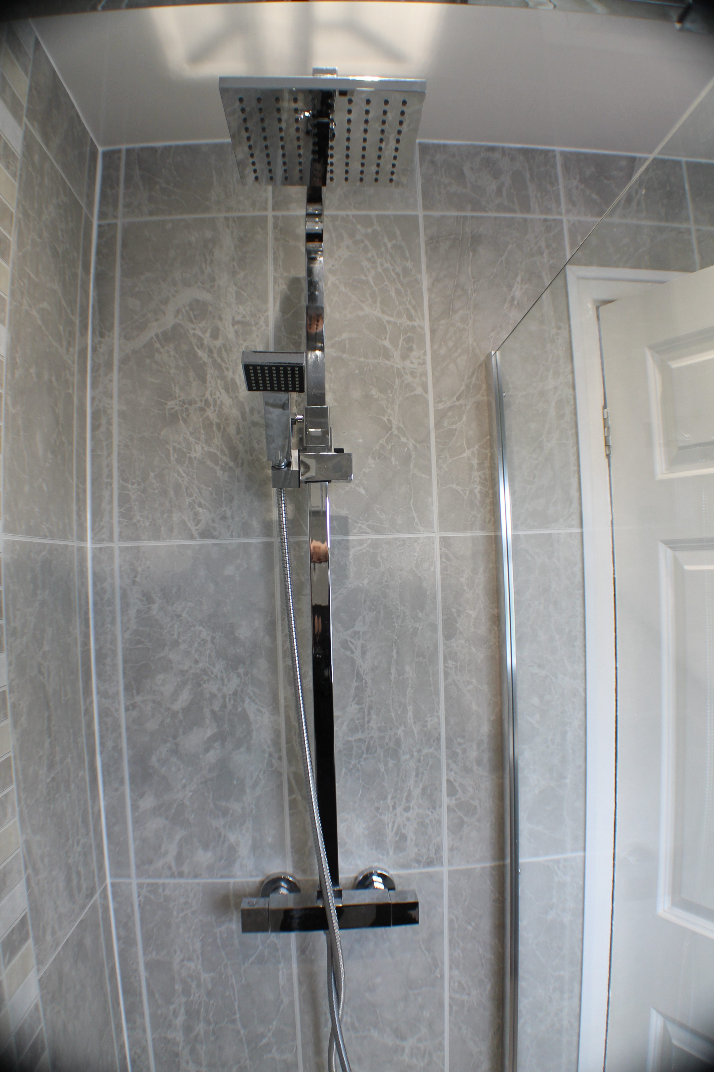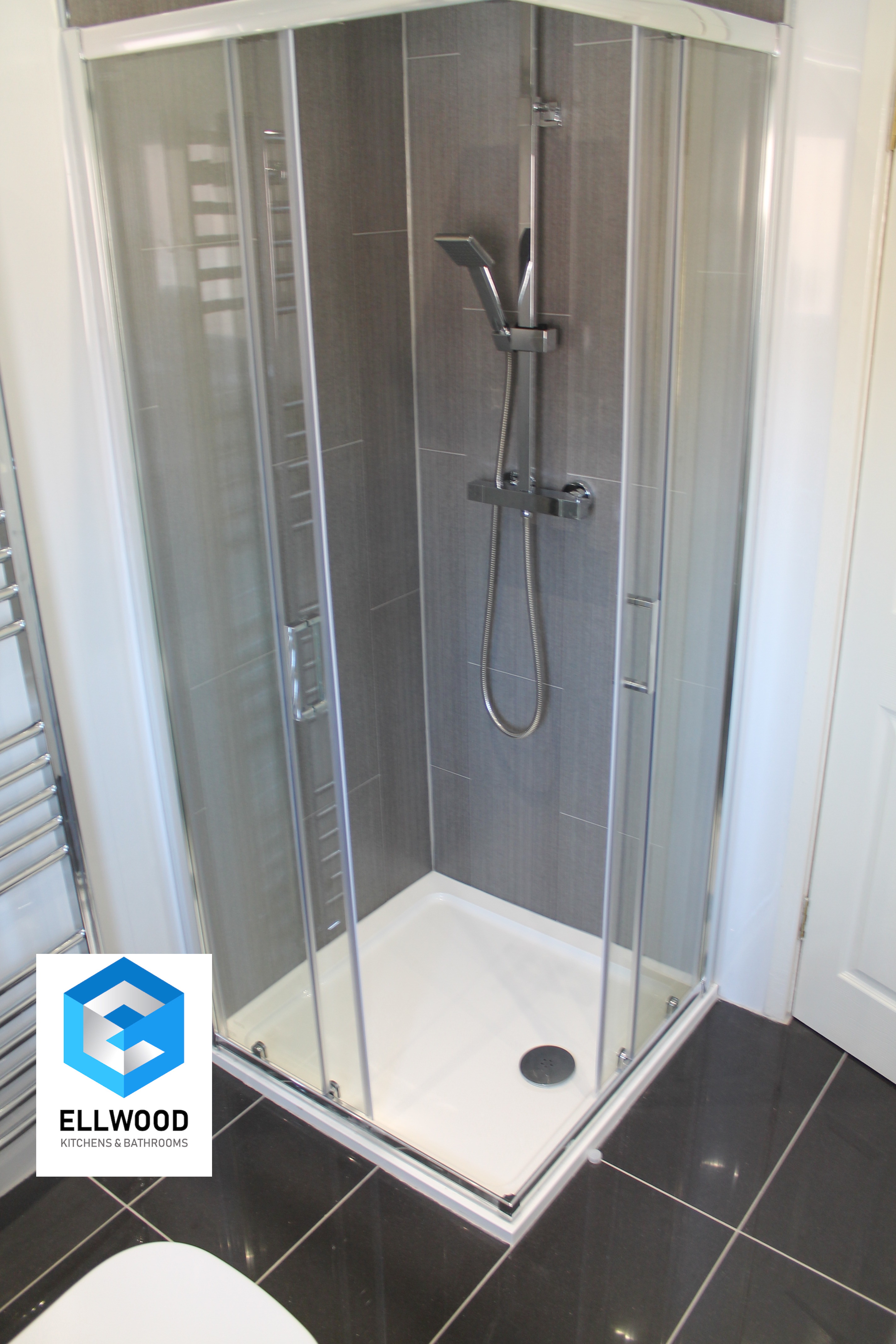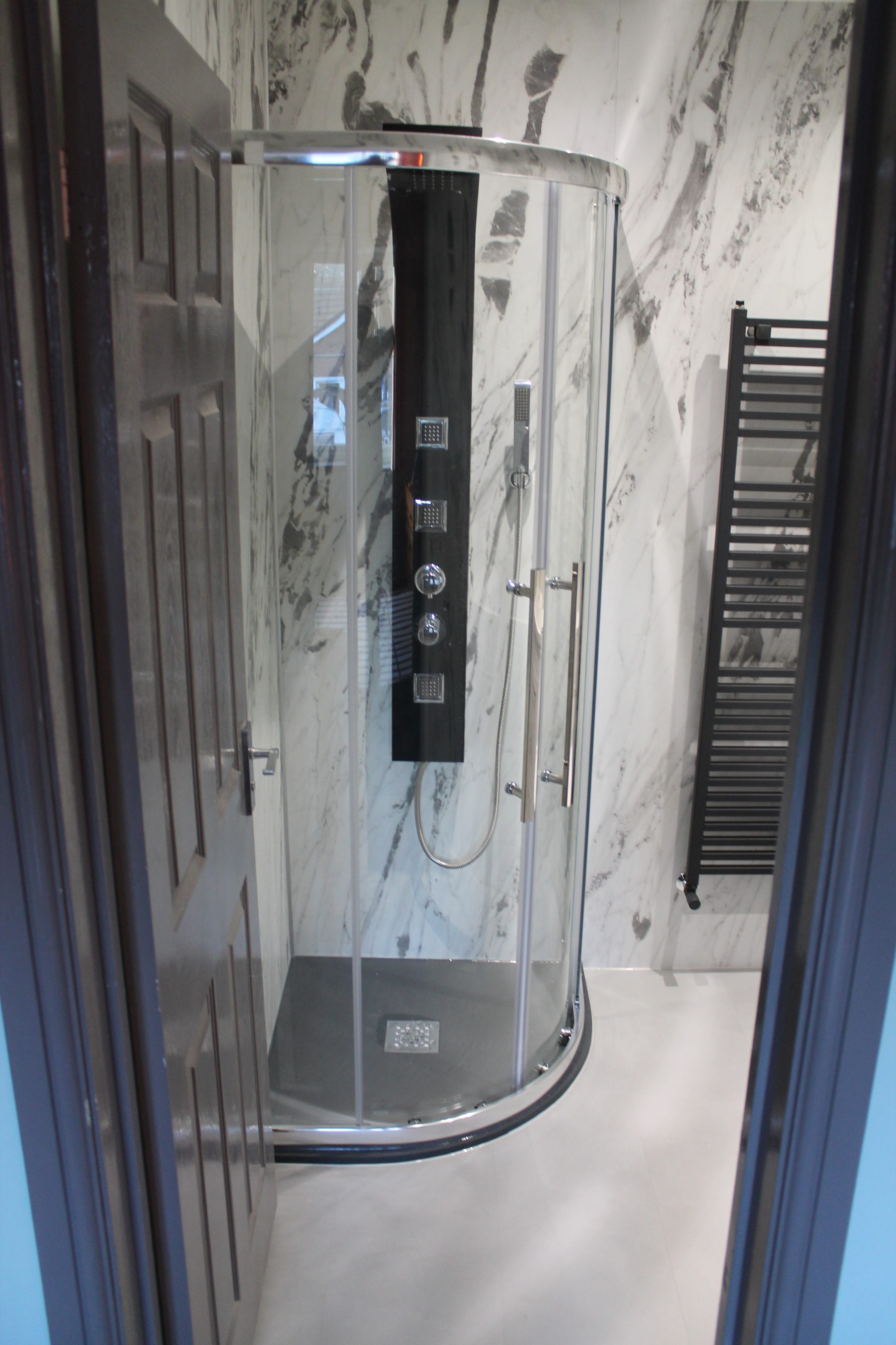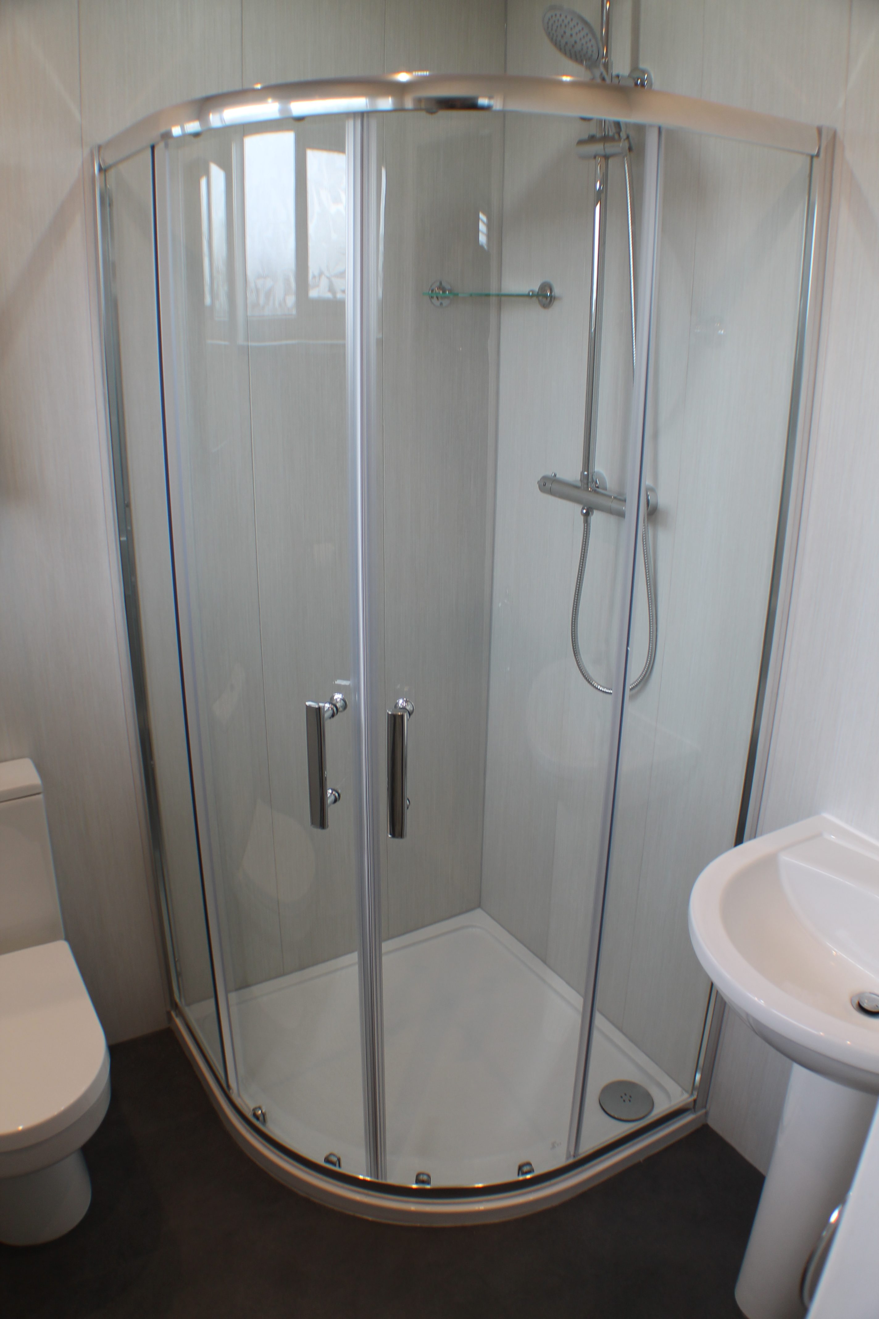Featuring Platinum Abstract Wall Cladding, a 900 Quadrant Shower Enclosure & Rain-head Shower.