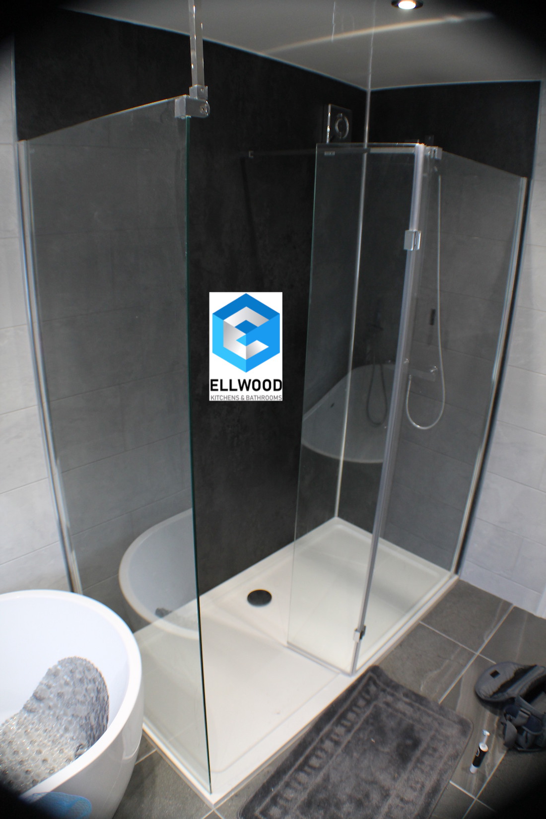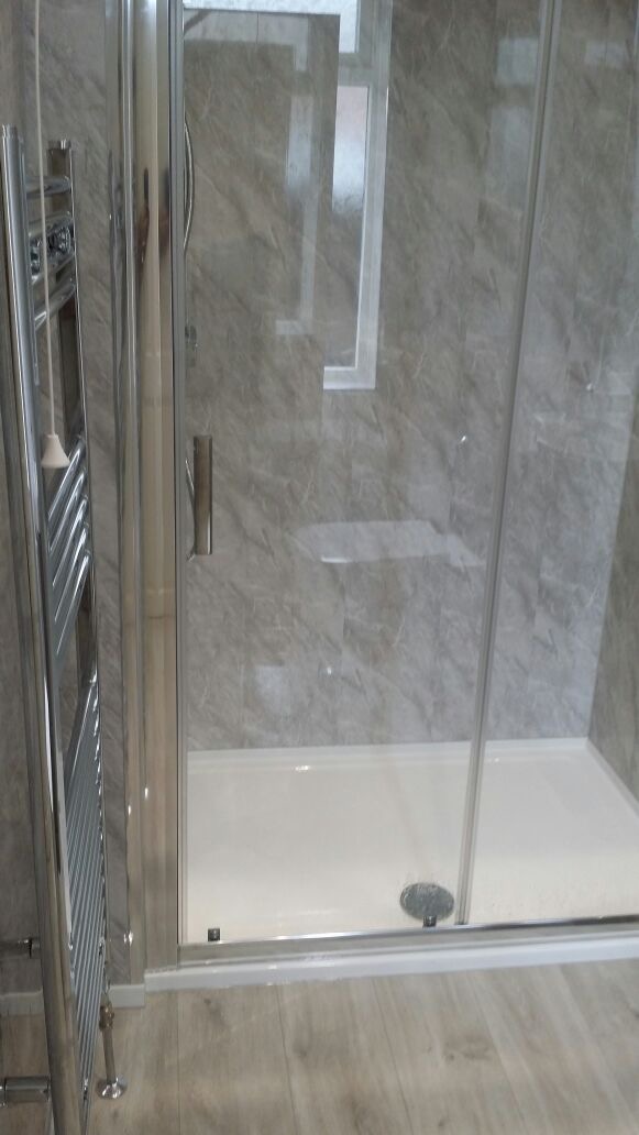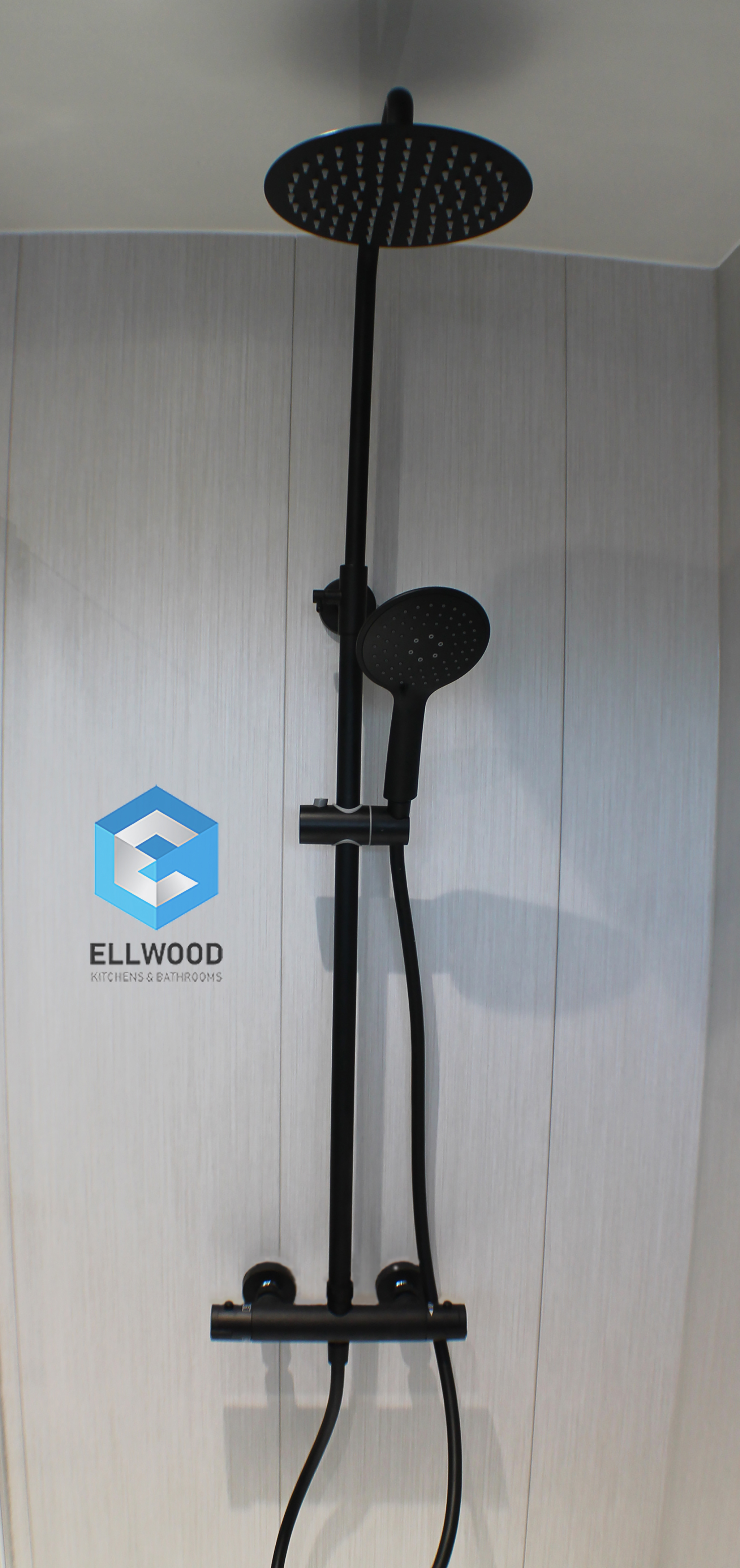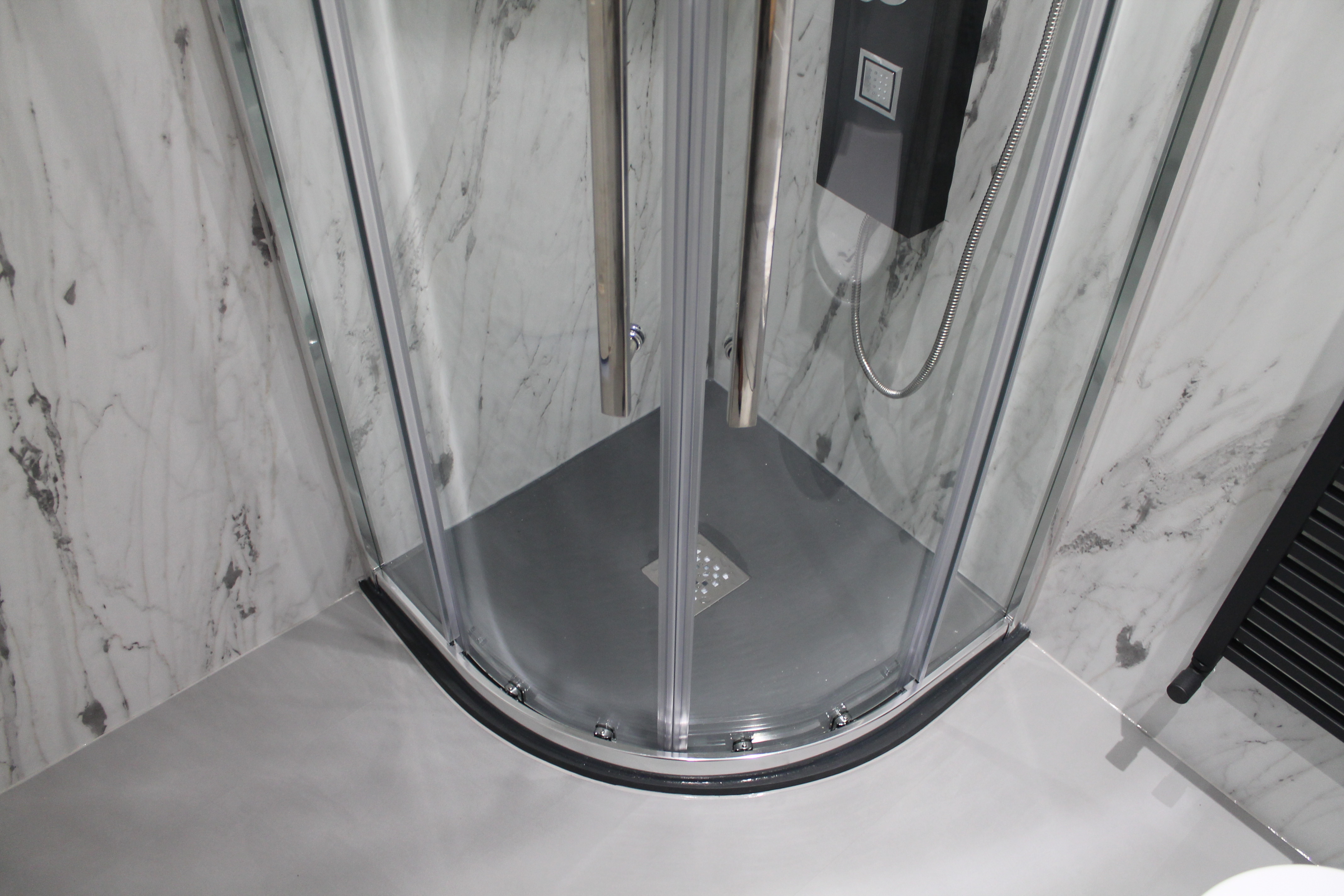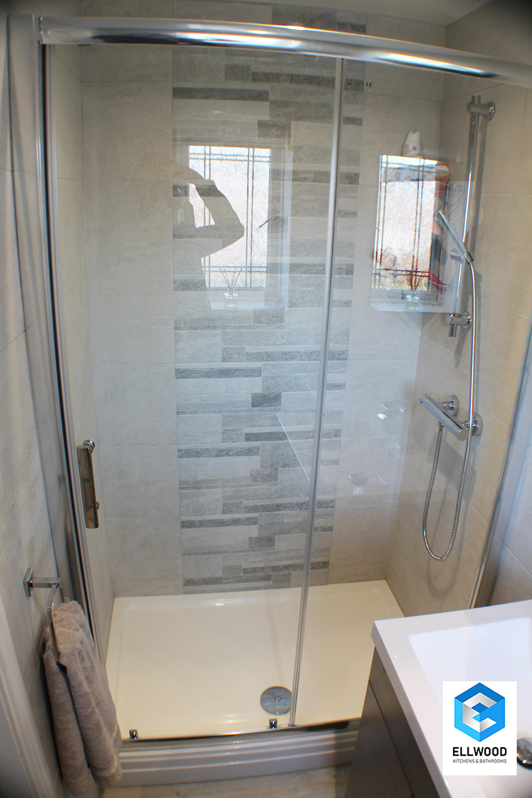 Featuring Platinum Abstract Wall Cladding, a 900 Quadrant Shower Enclosure & Rain-head Shower.