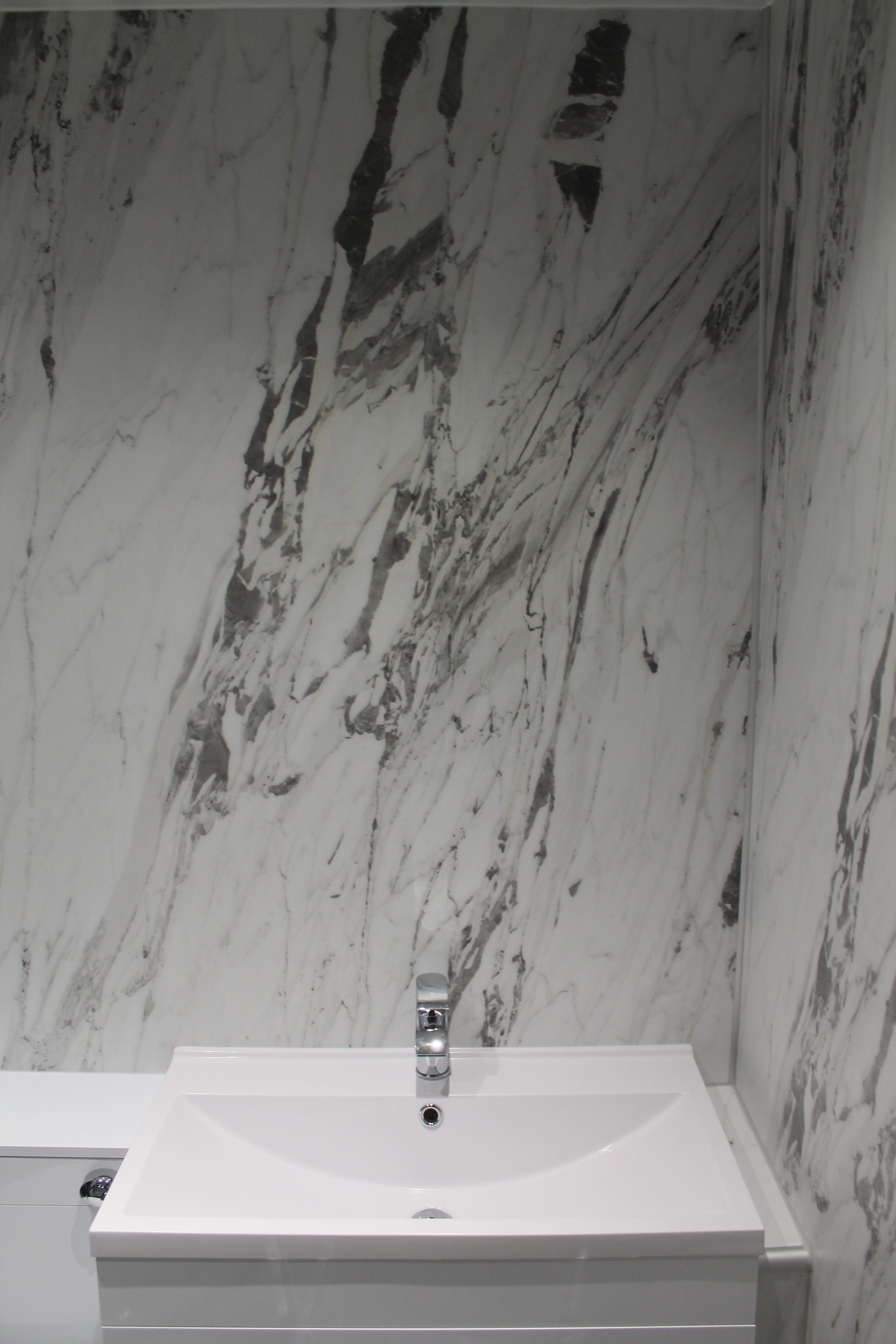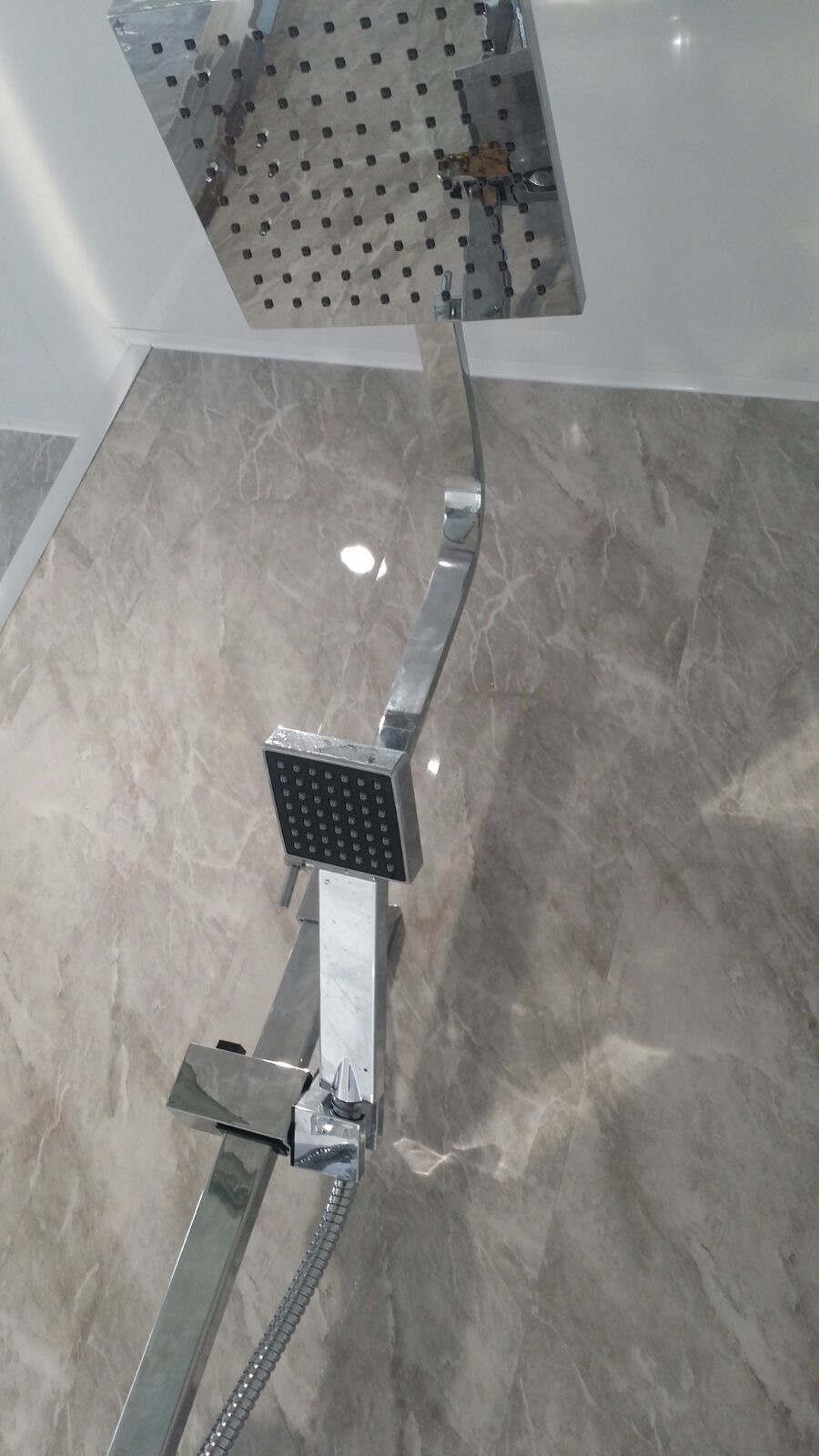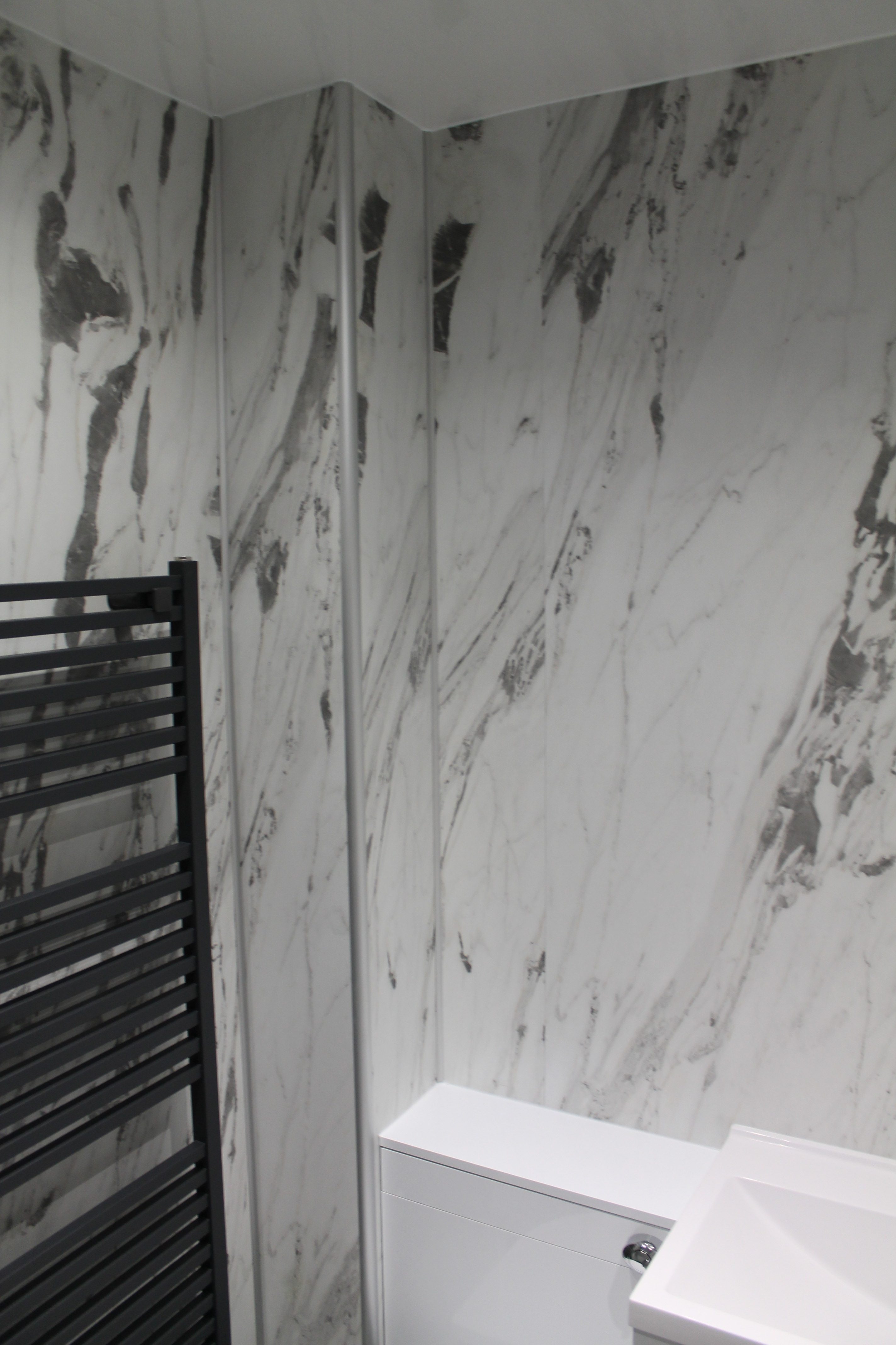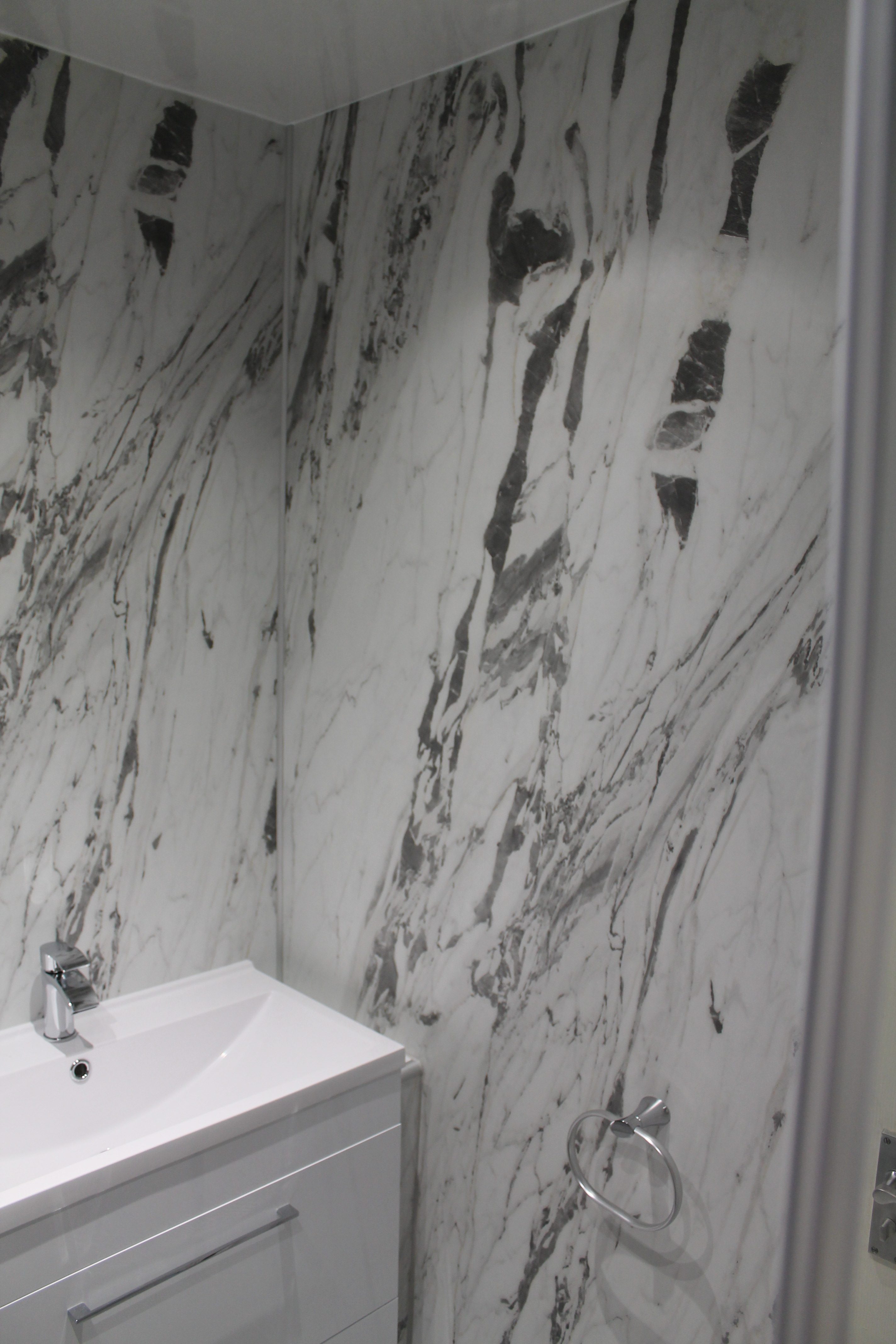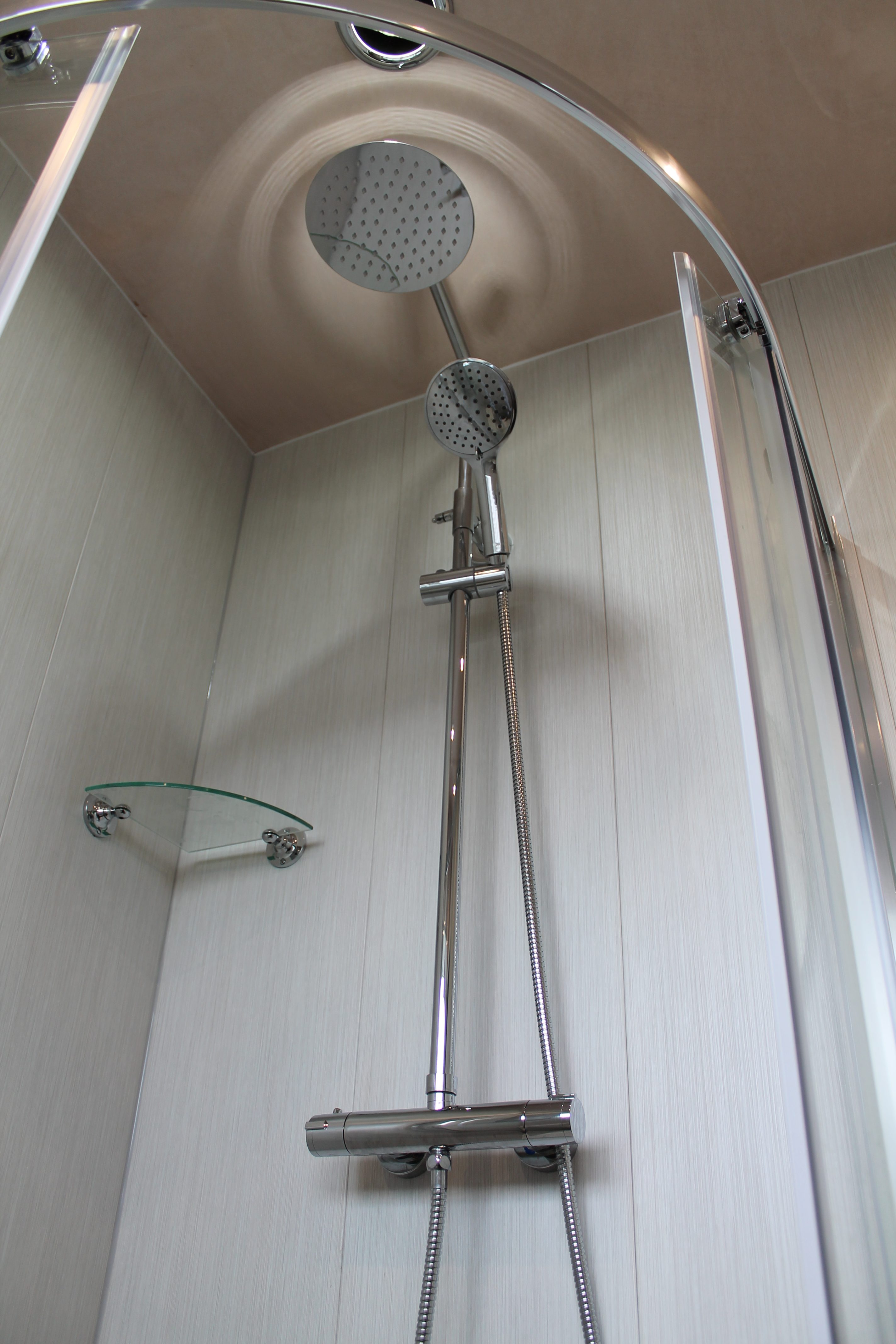 Featuring Platinum Abstract Wall Cladding, a 900 Quadrant Shower Enclosure & Rain-head Shower.