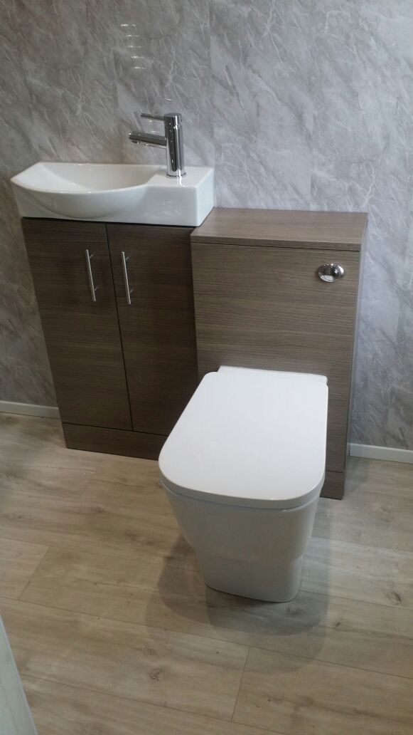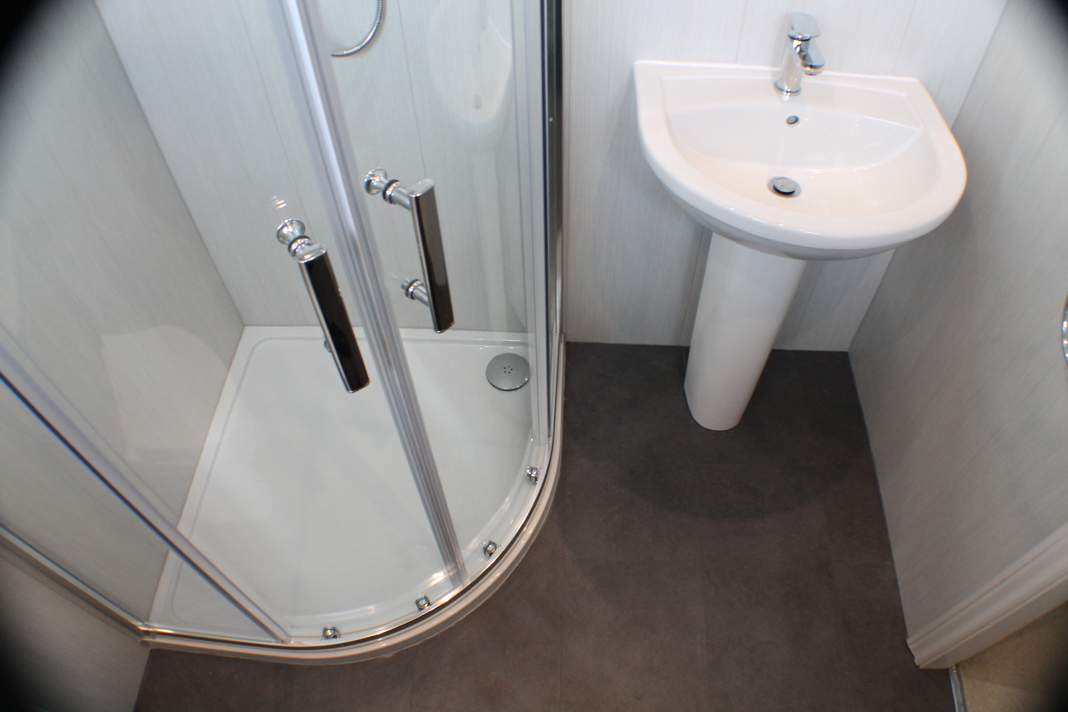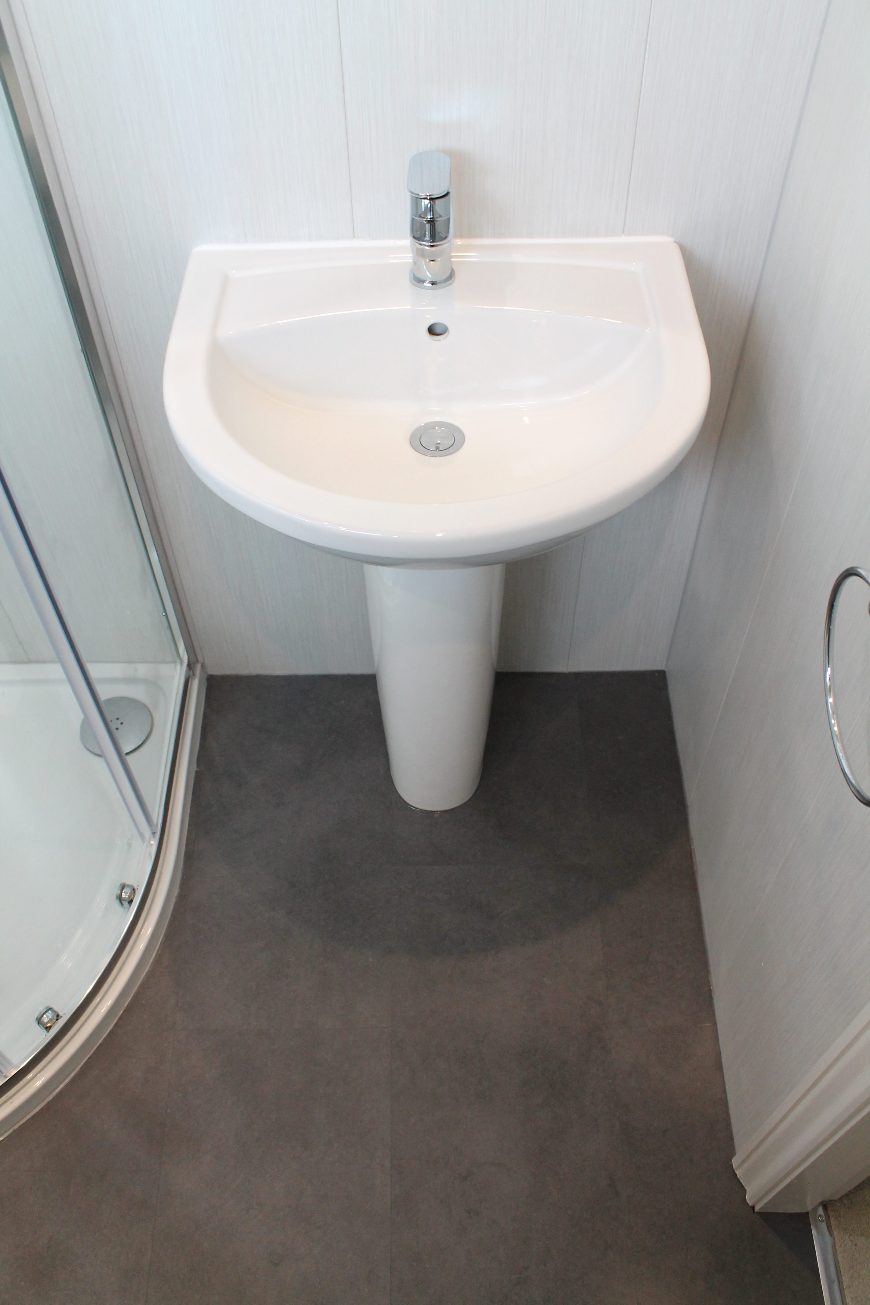 With slimline vanity & WC unit, sliding shower enclosure and click vinyl flooring.