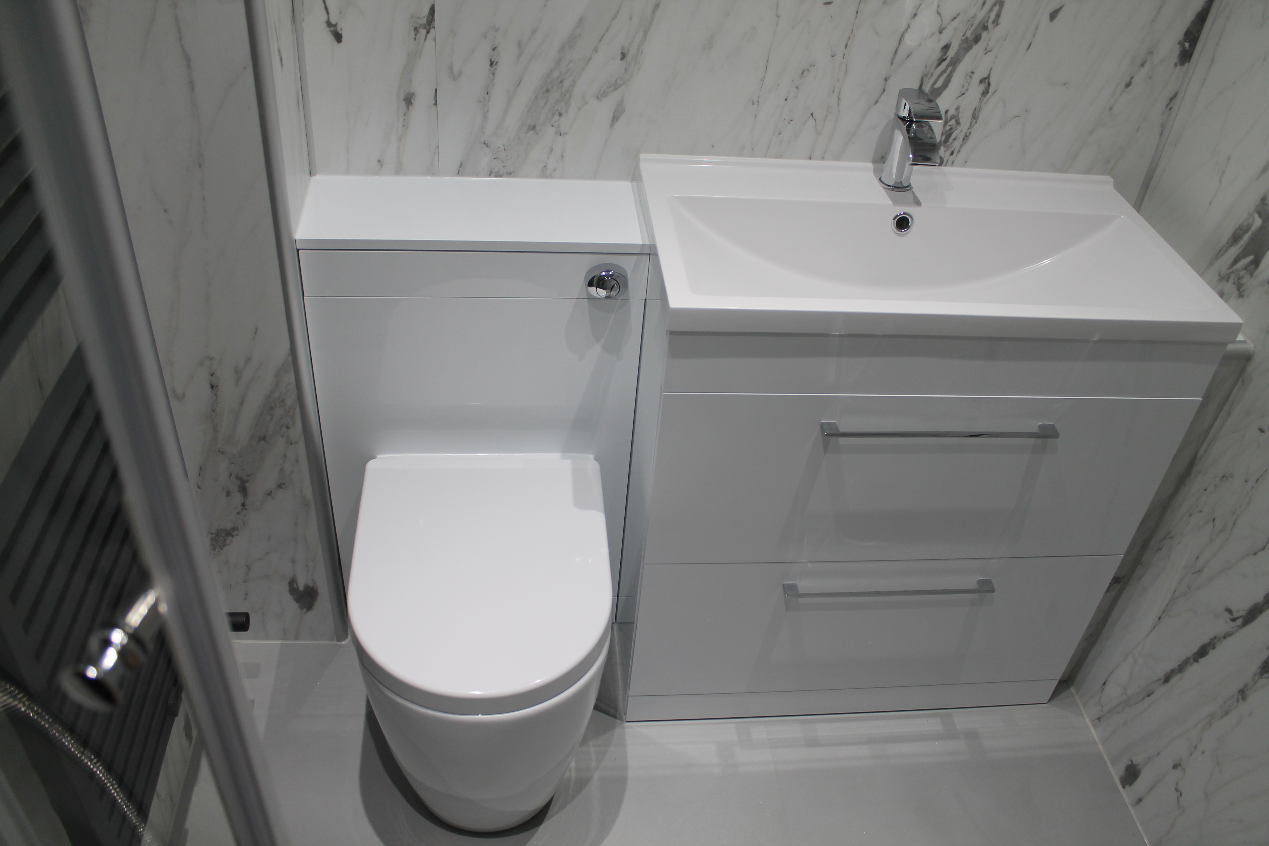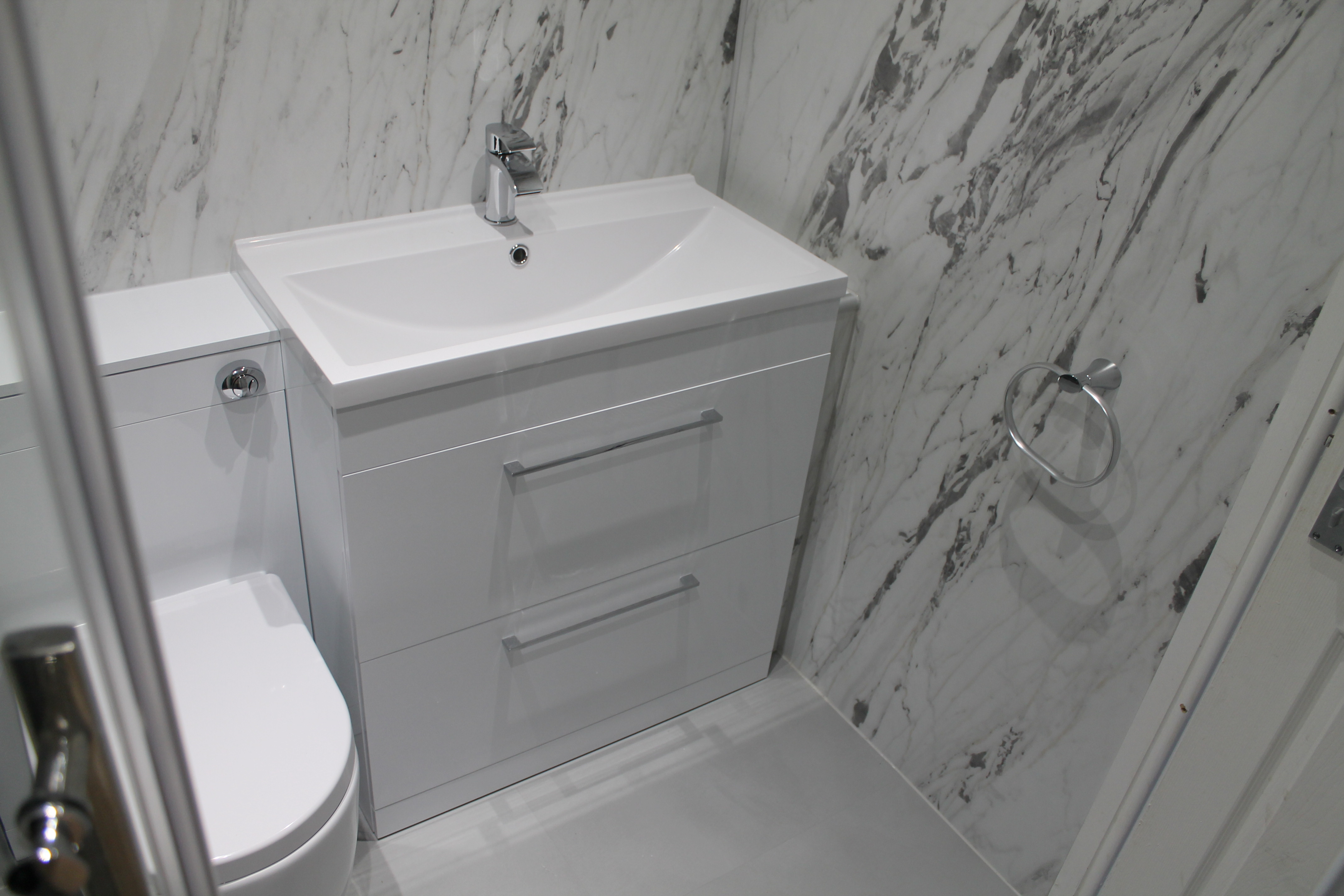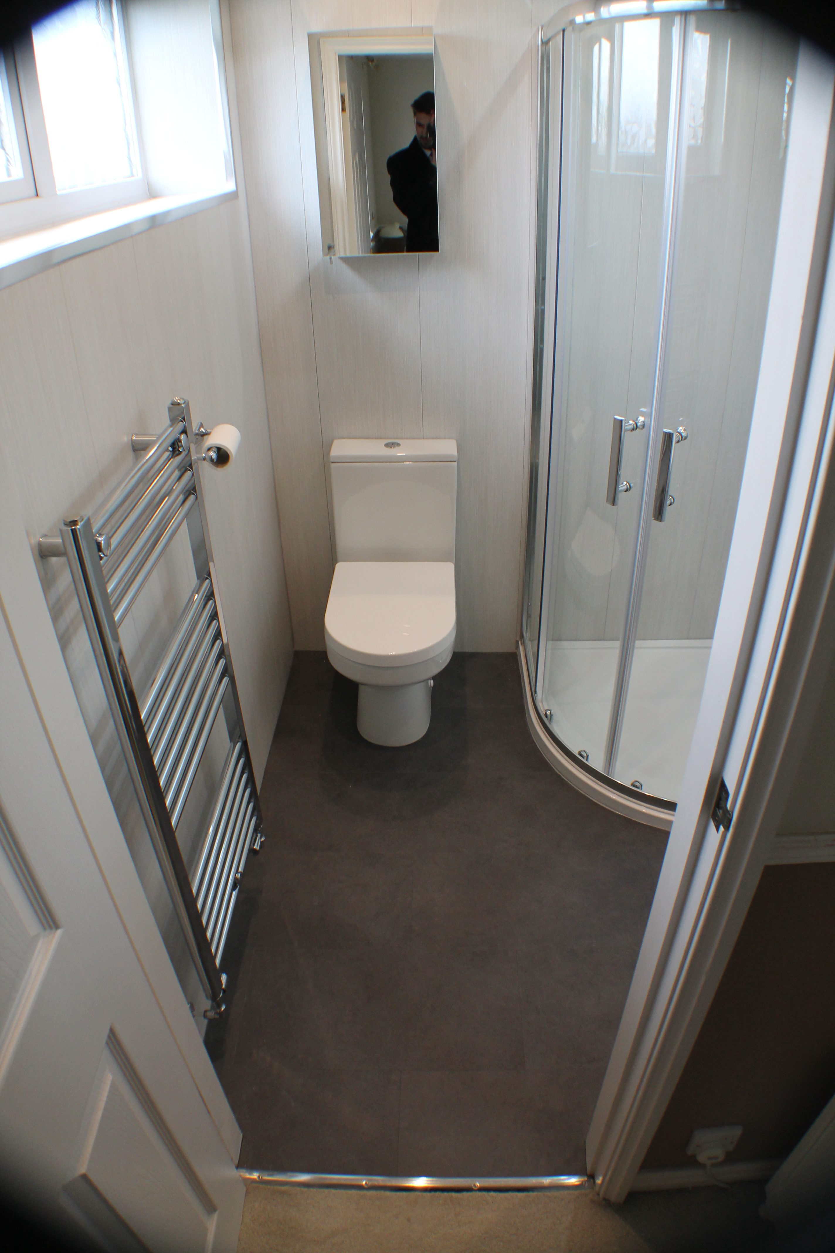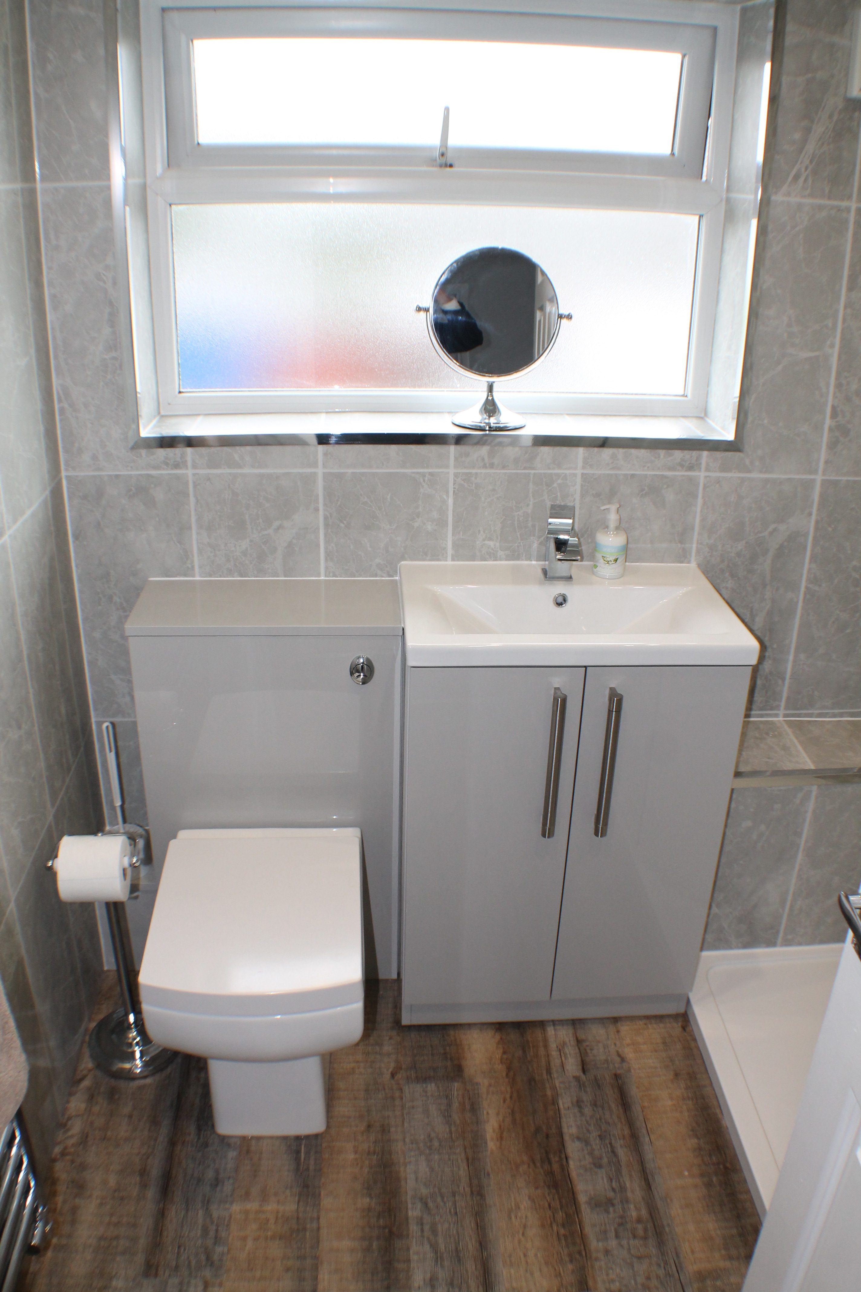 With walk-in shower enclosure, gloss grey furniture and click vinyl flooring.
