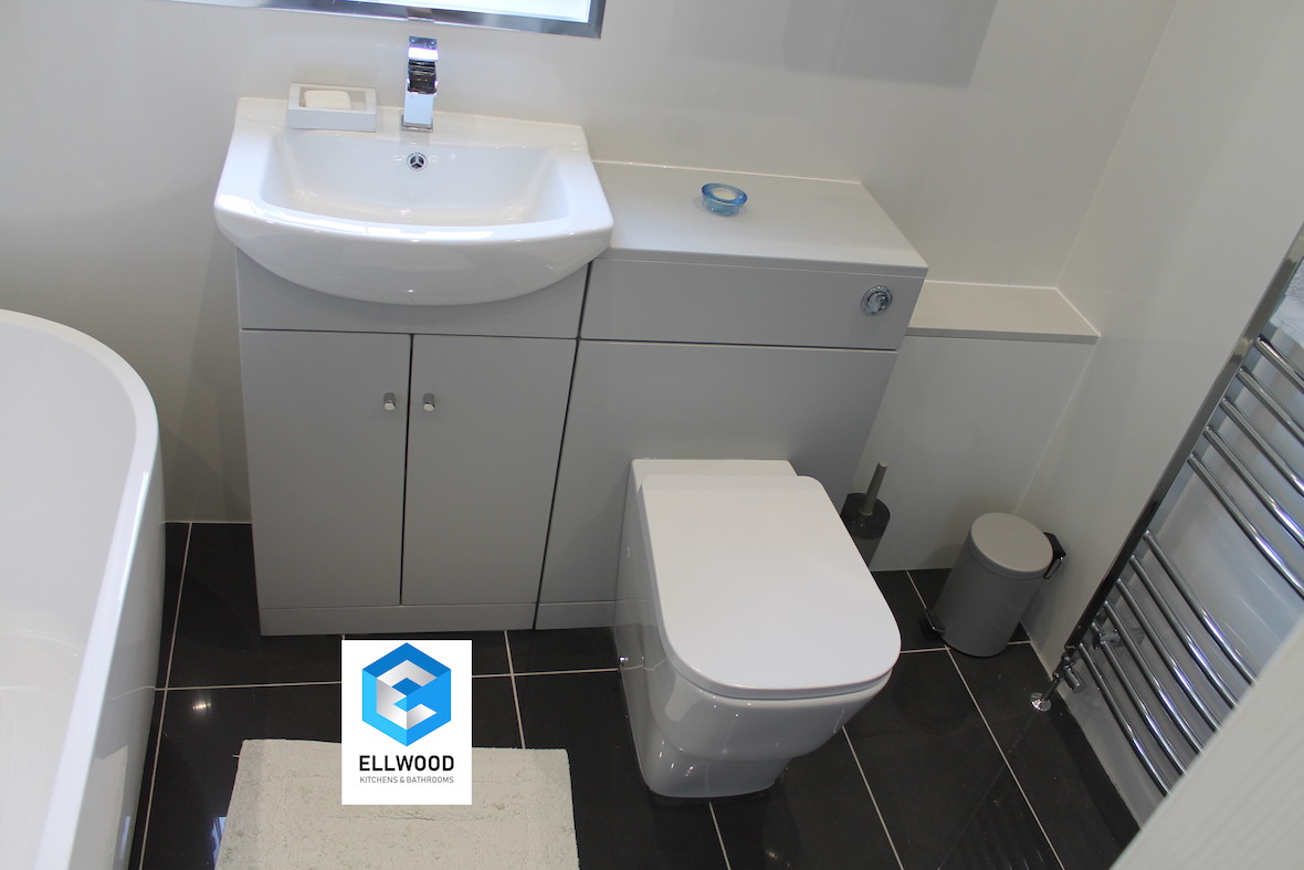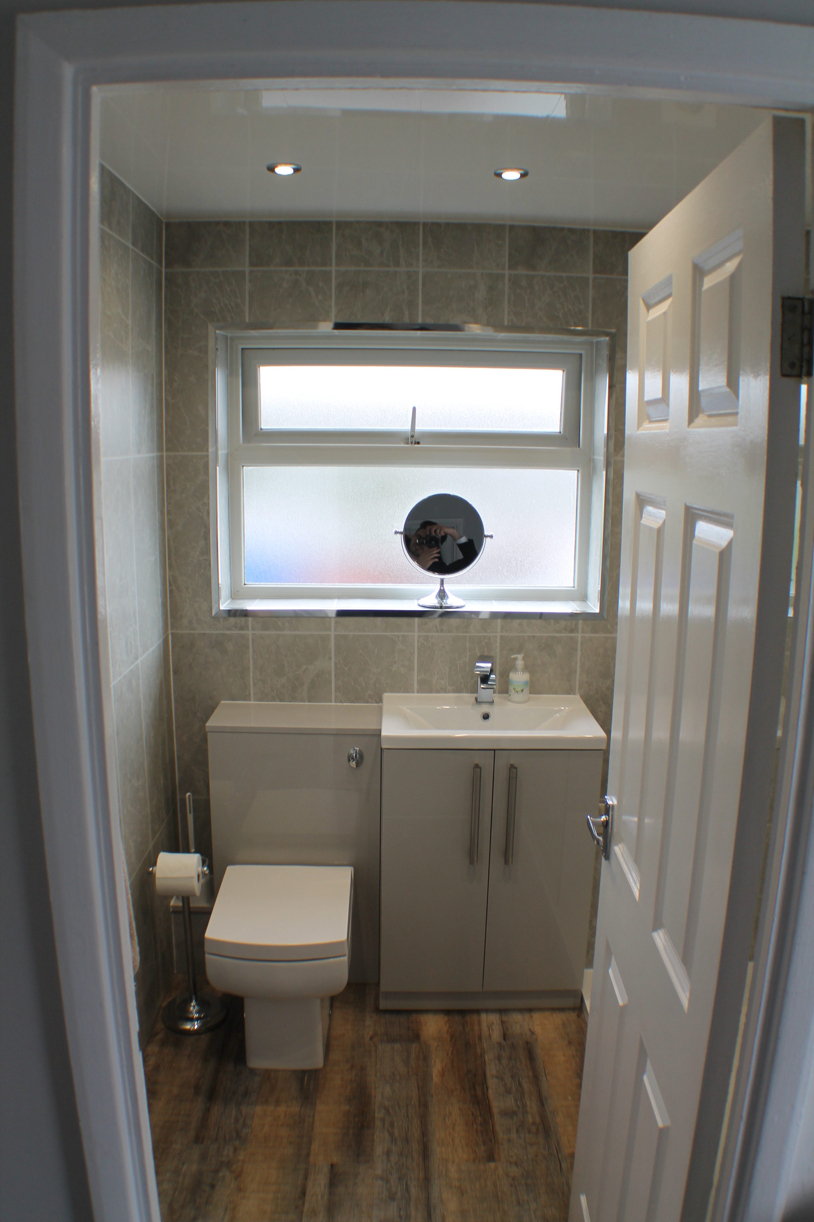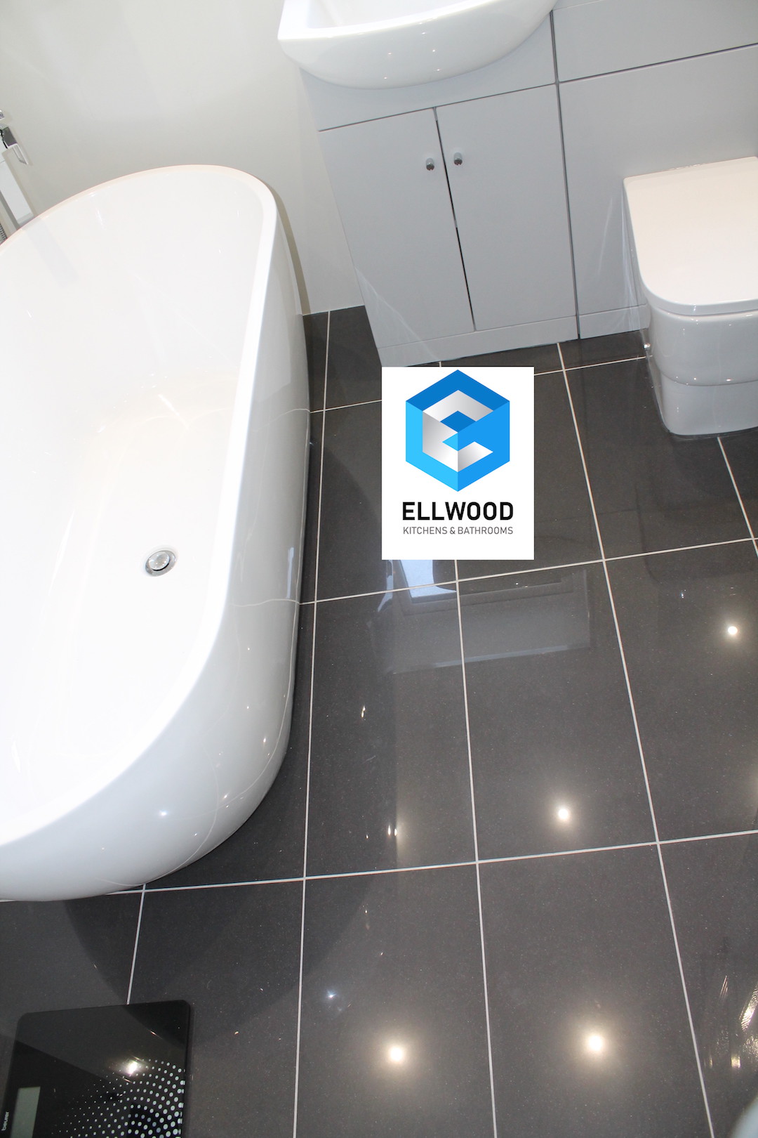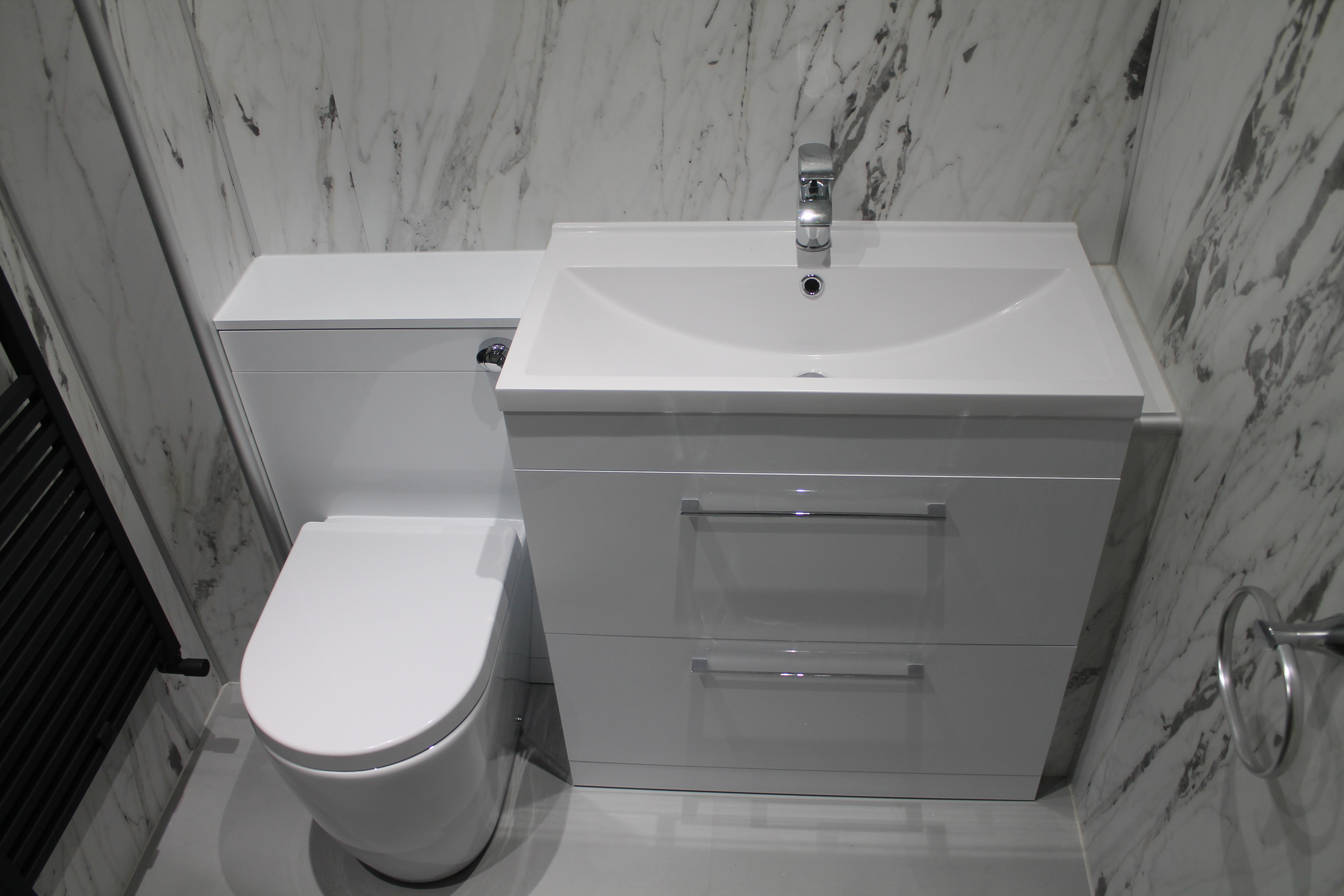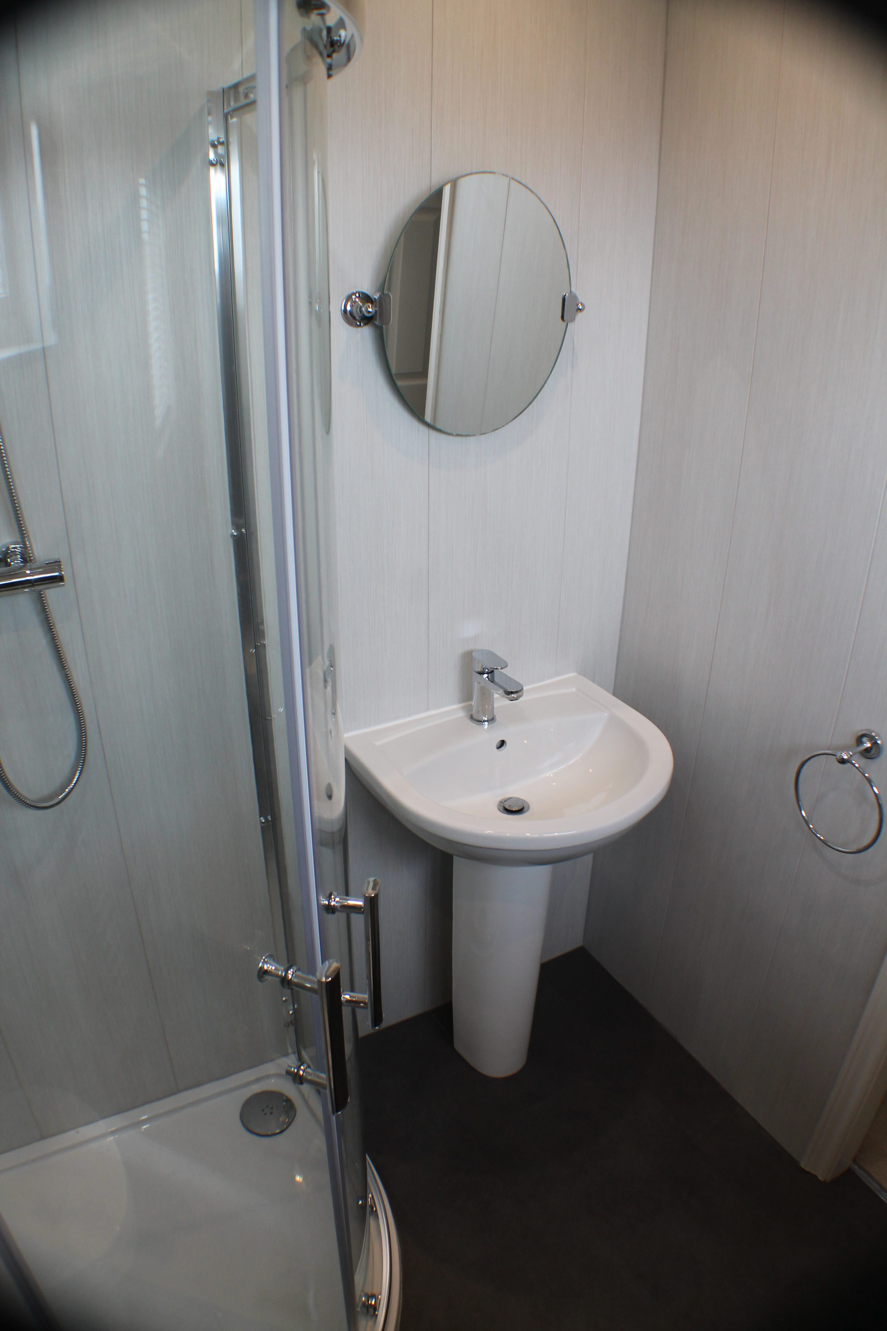 With walk-in shower enclosure, gloss grey furniture and click vinyl flooring.