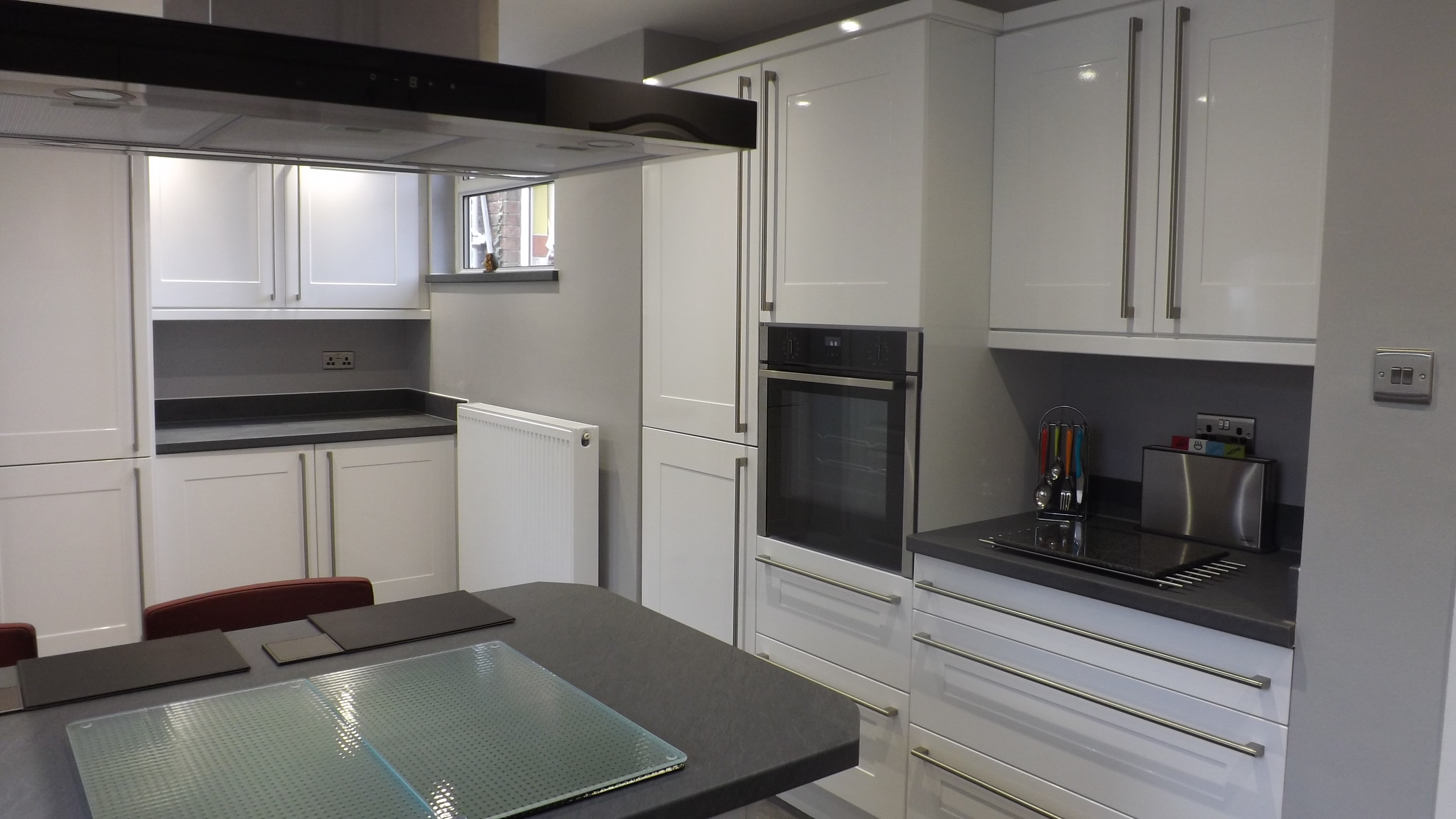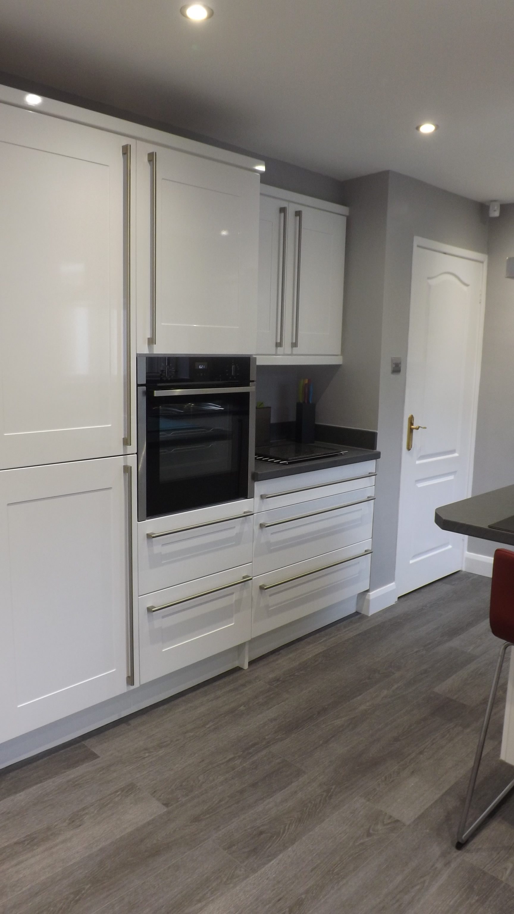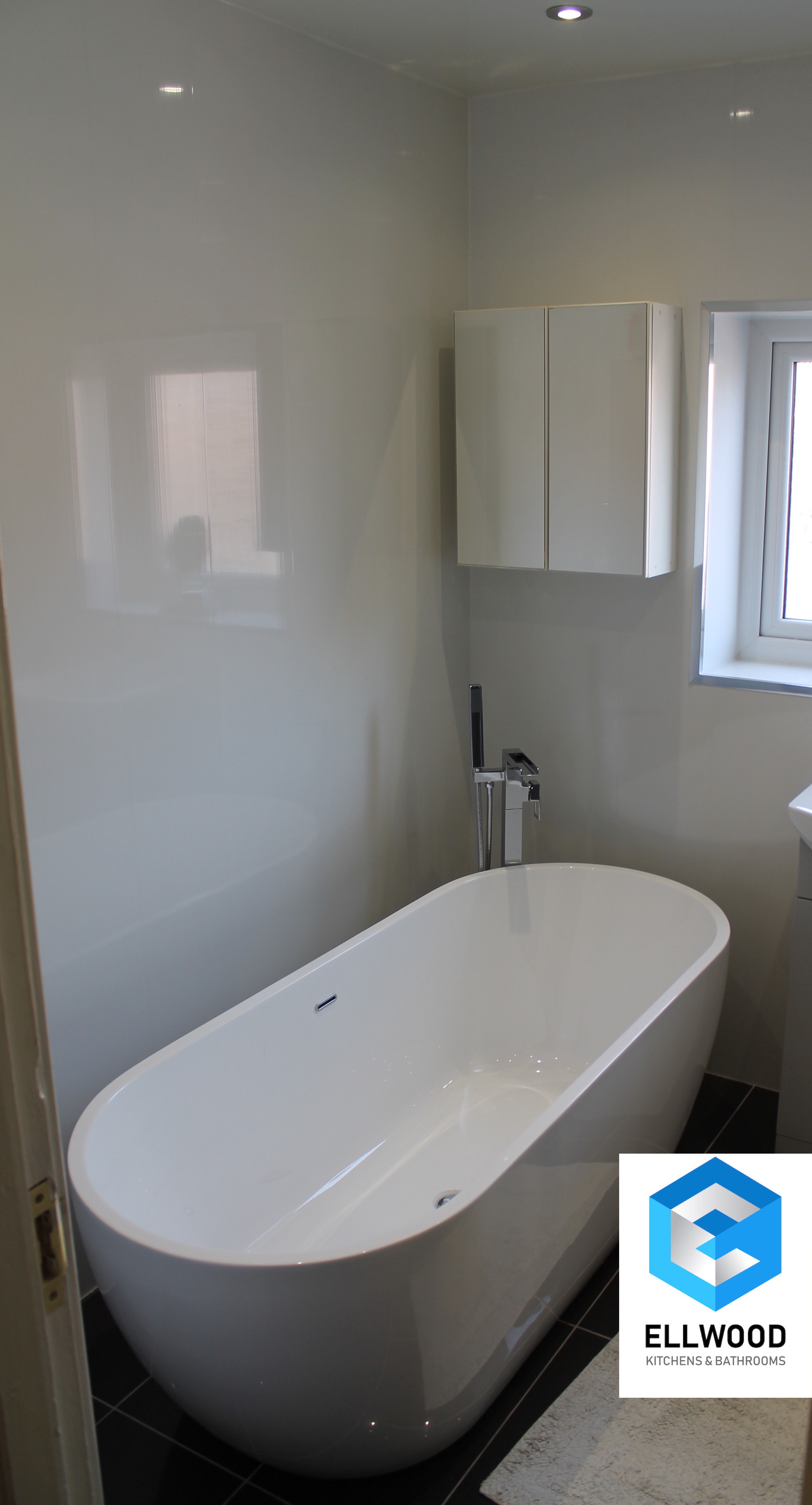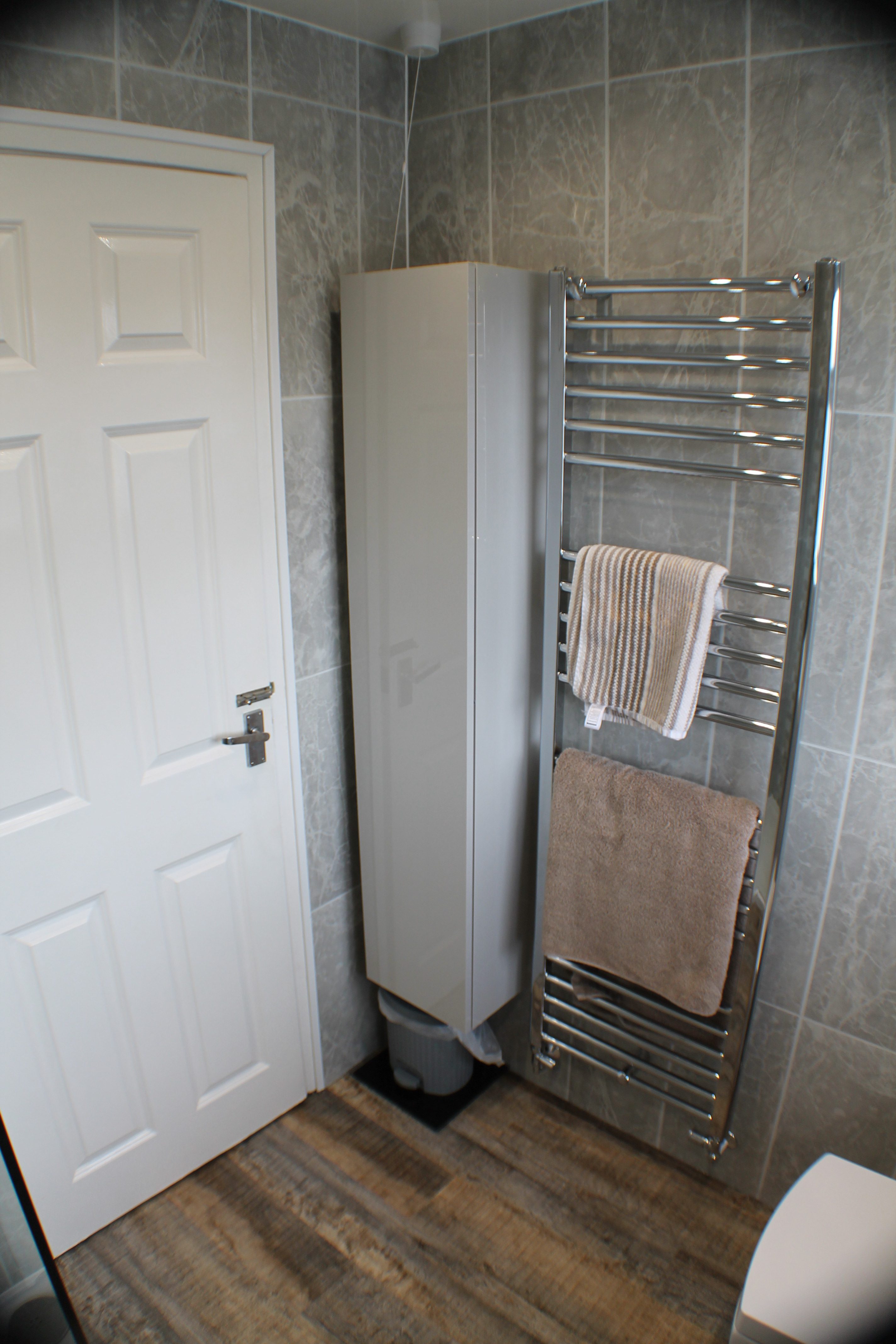 With walk-in shower enclosure, gloss grey furniture and click vinyl flooring.