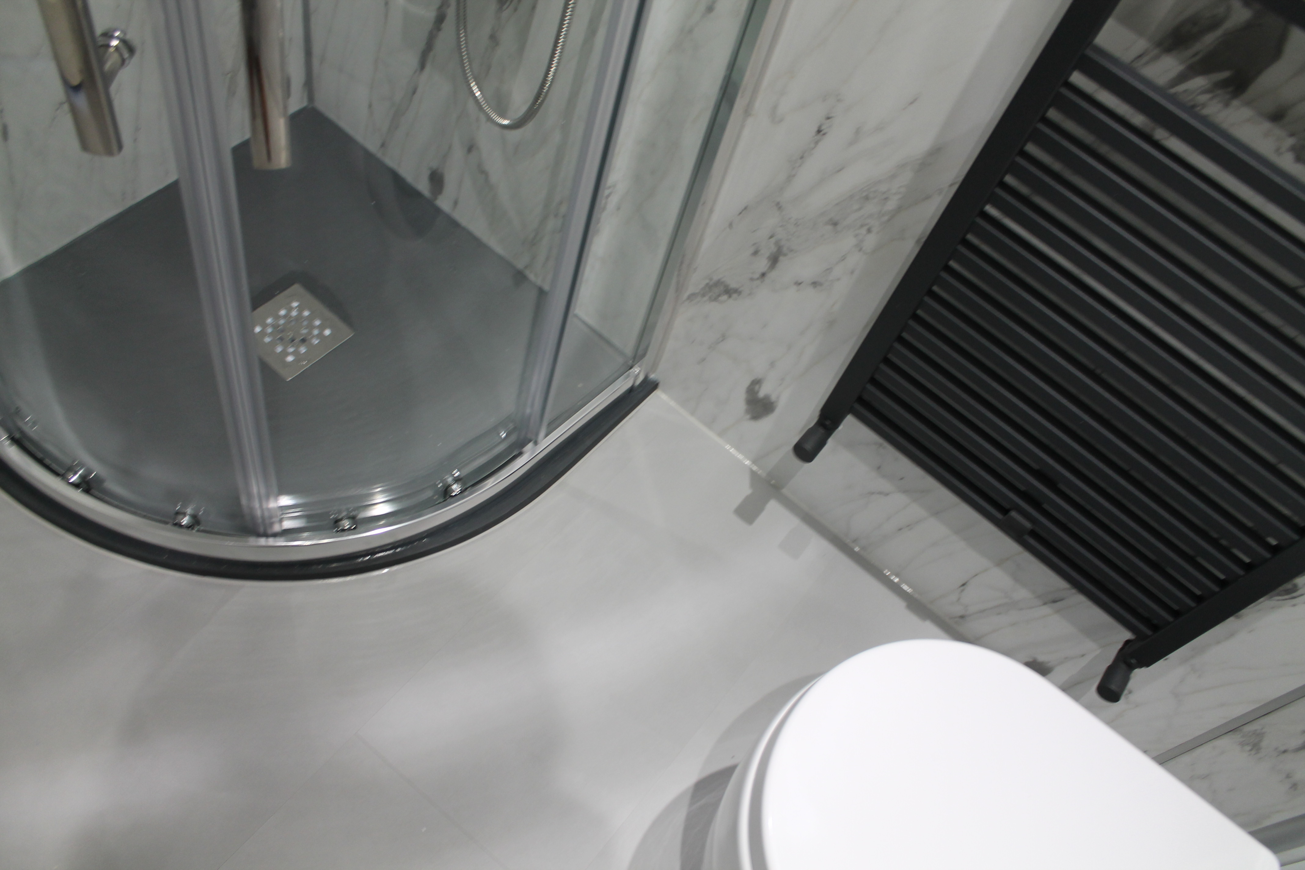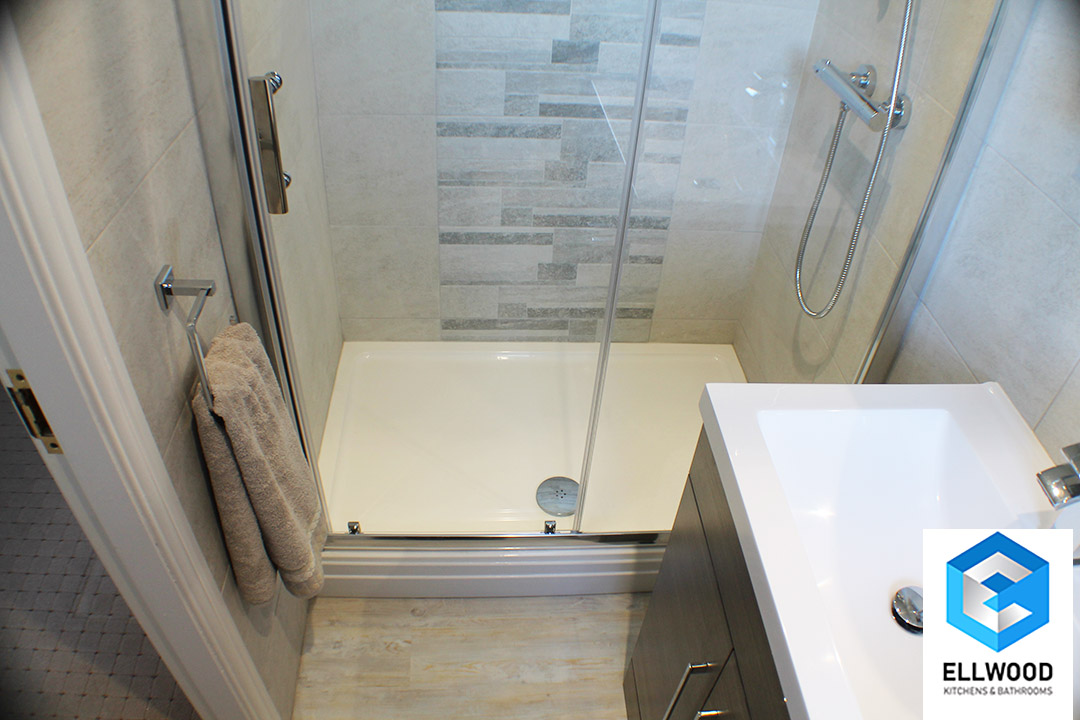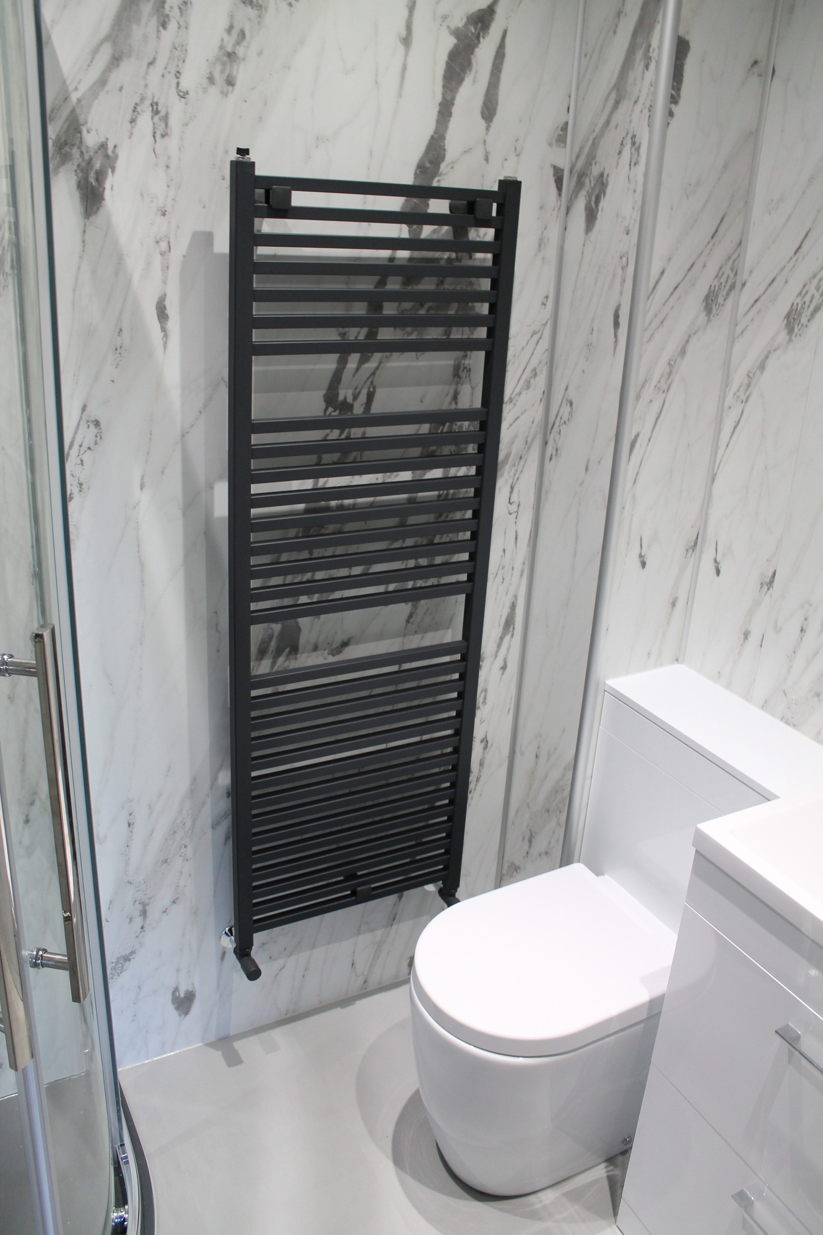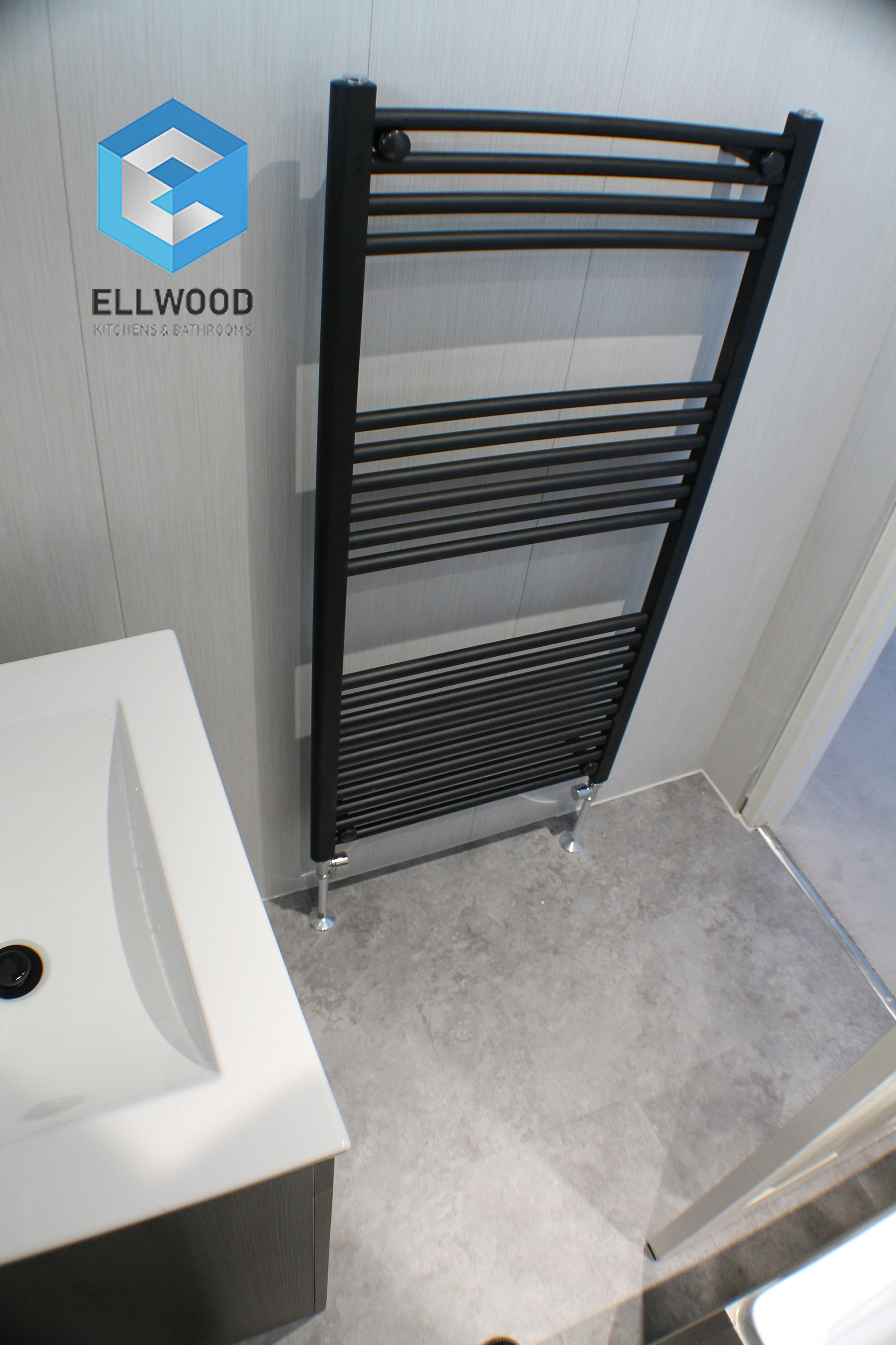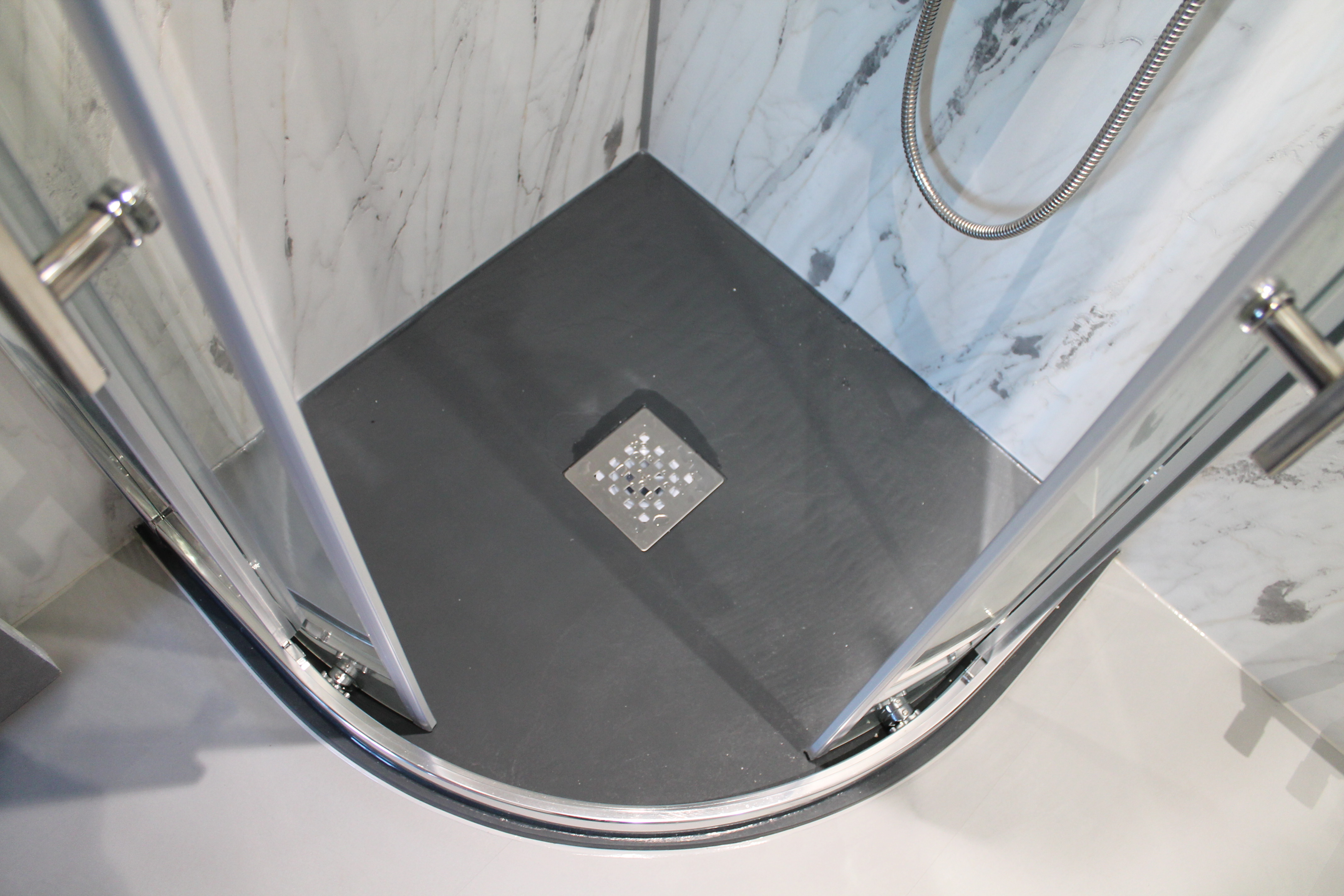 With white gloss idon units, quadrant cubicle, anthracite radiator, anthracite slate tray and grey click-vinyl floor.