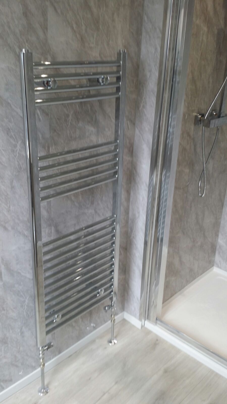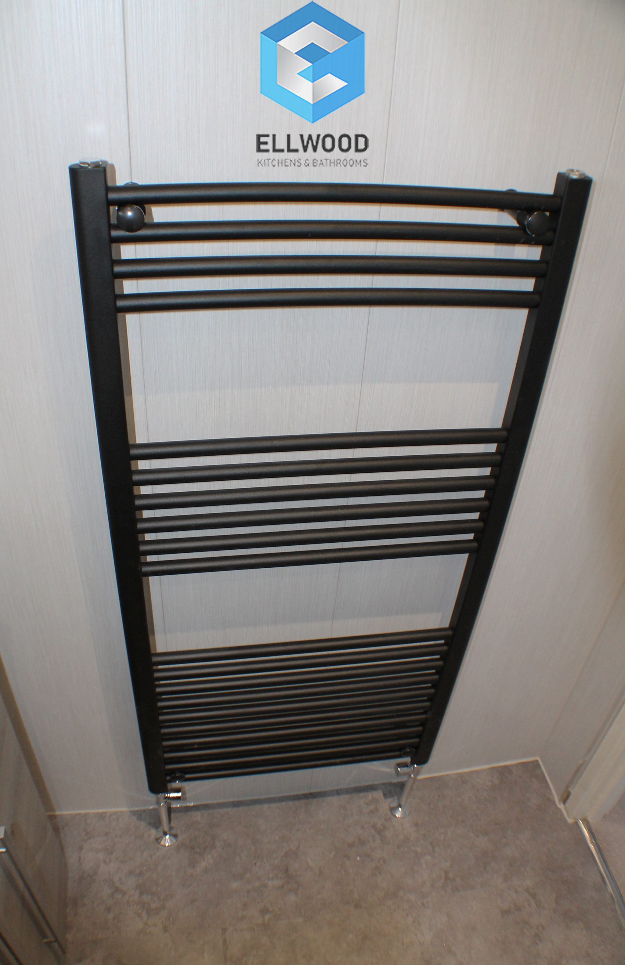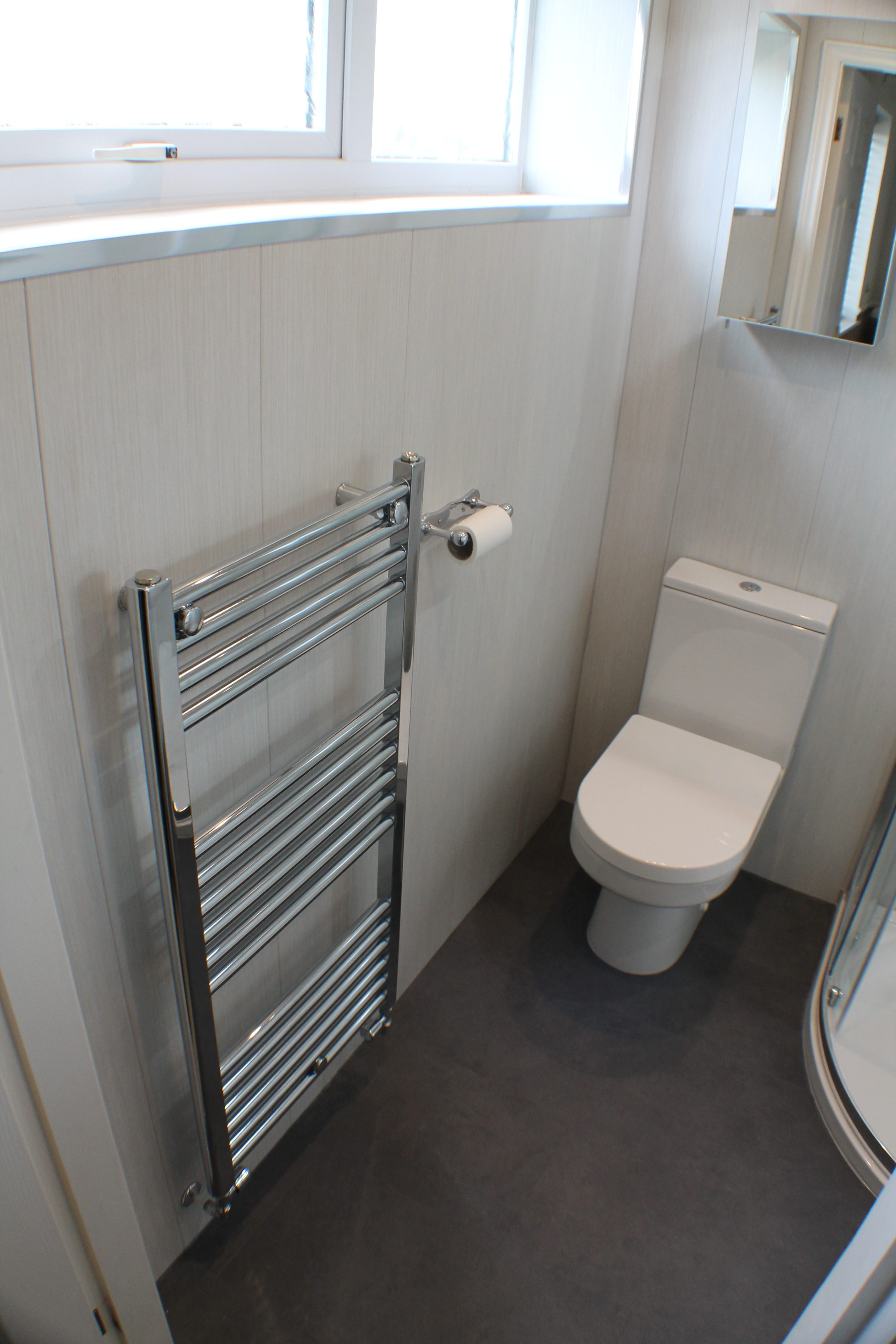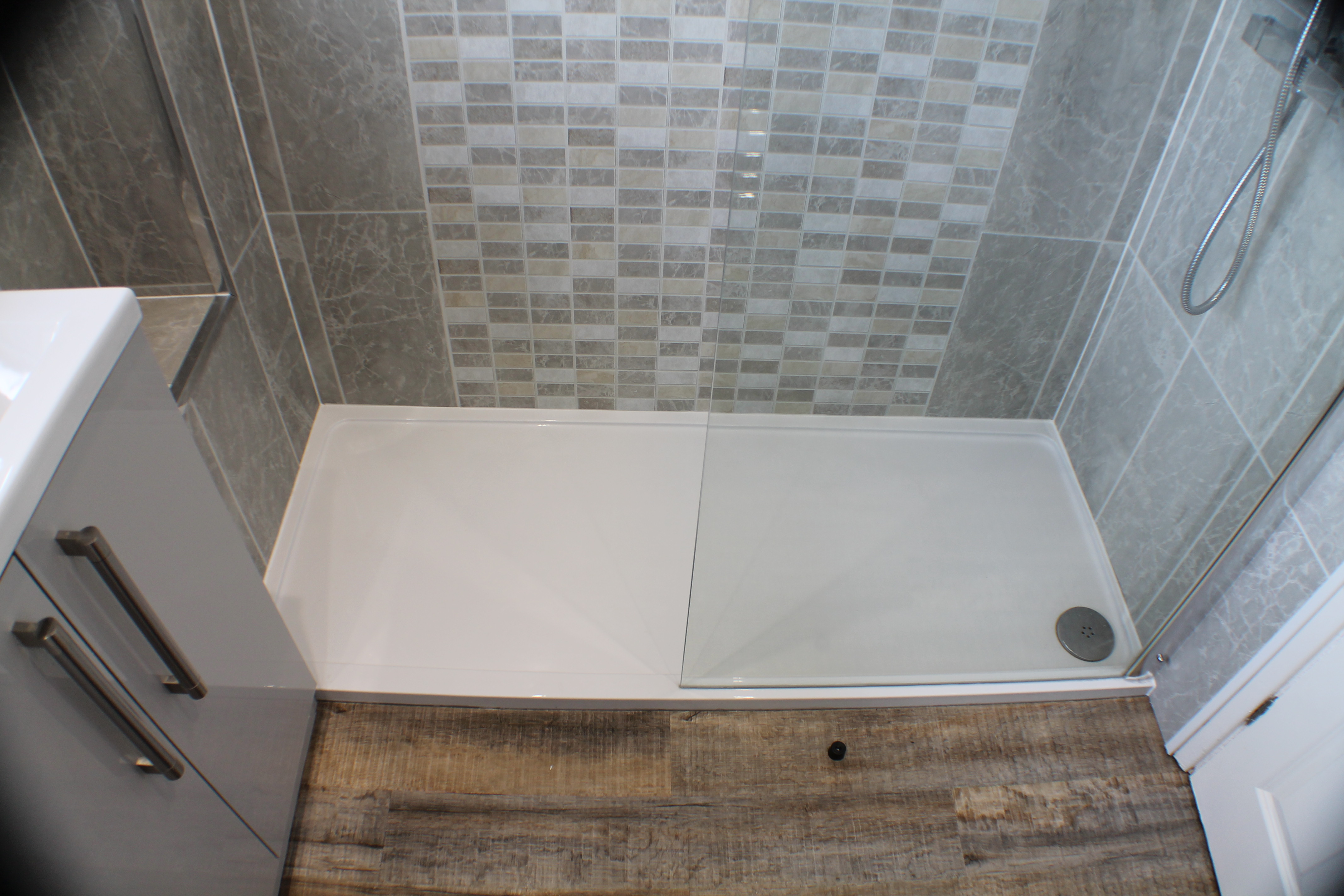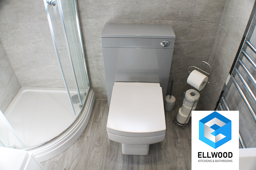 With white gloss idon units, quadrant cubicle, anthracite radiator, anthracite slate tray and grey click-vinyl floor.