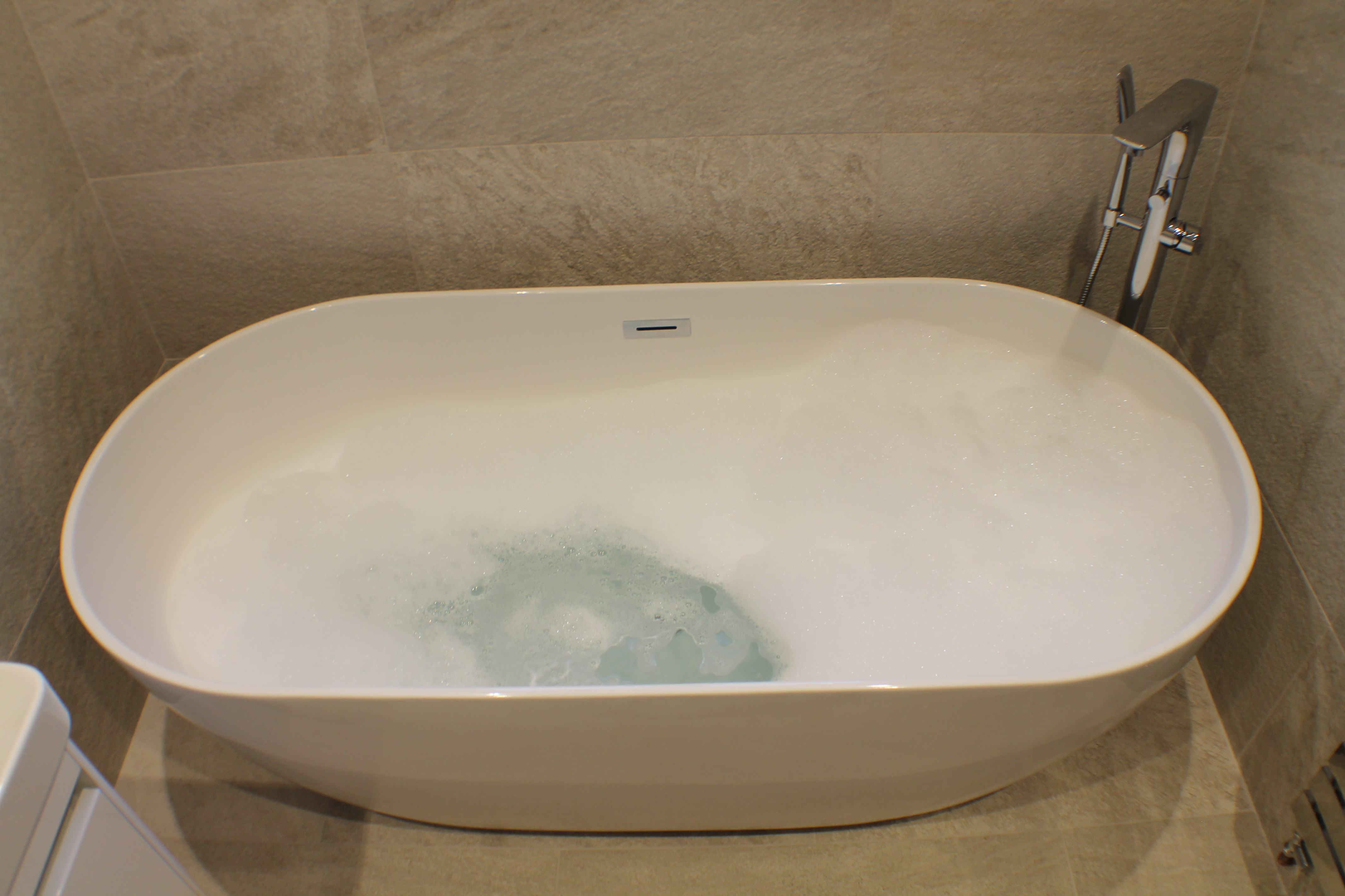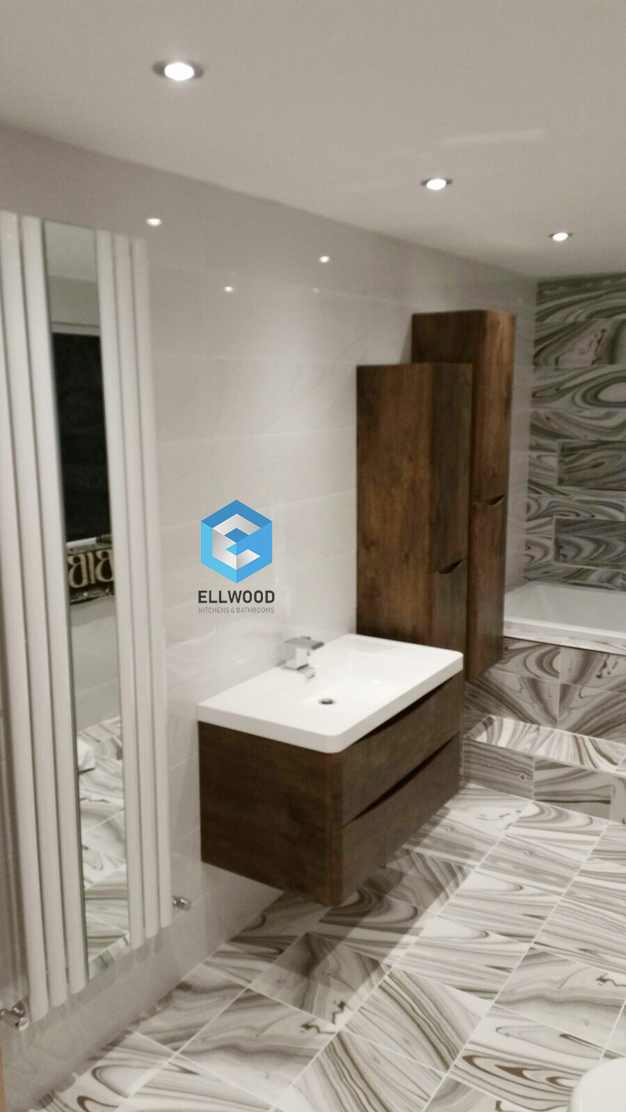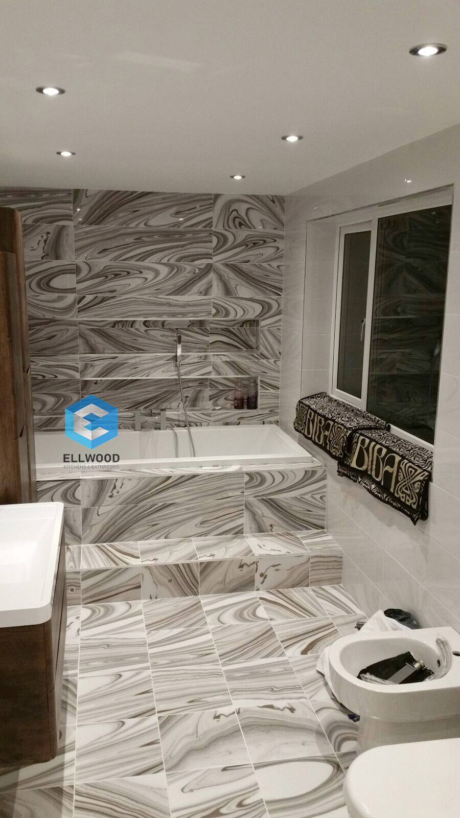 With feature tiling down the centre of the room and including wall hung furniture and a tiled in bath.