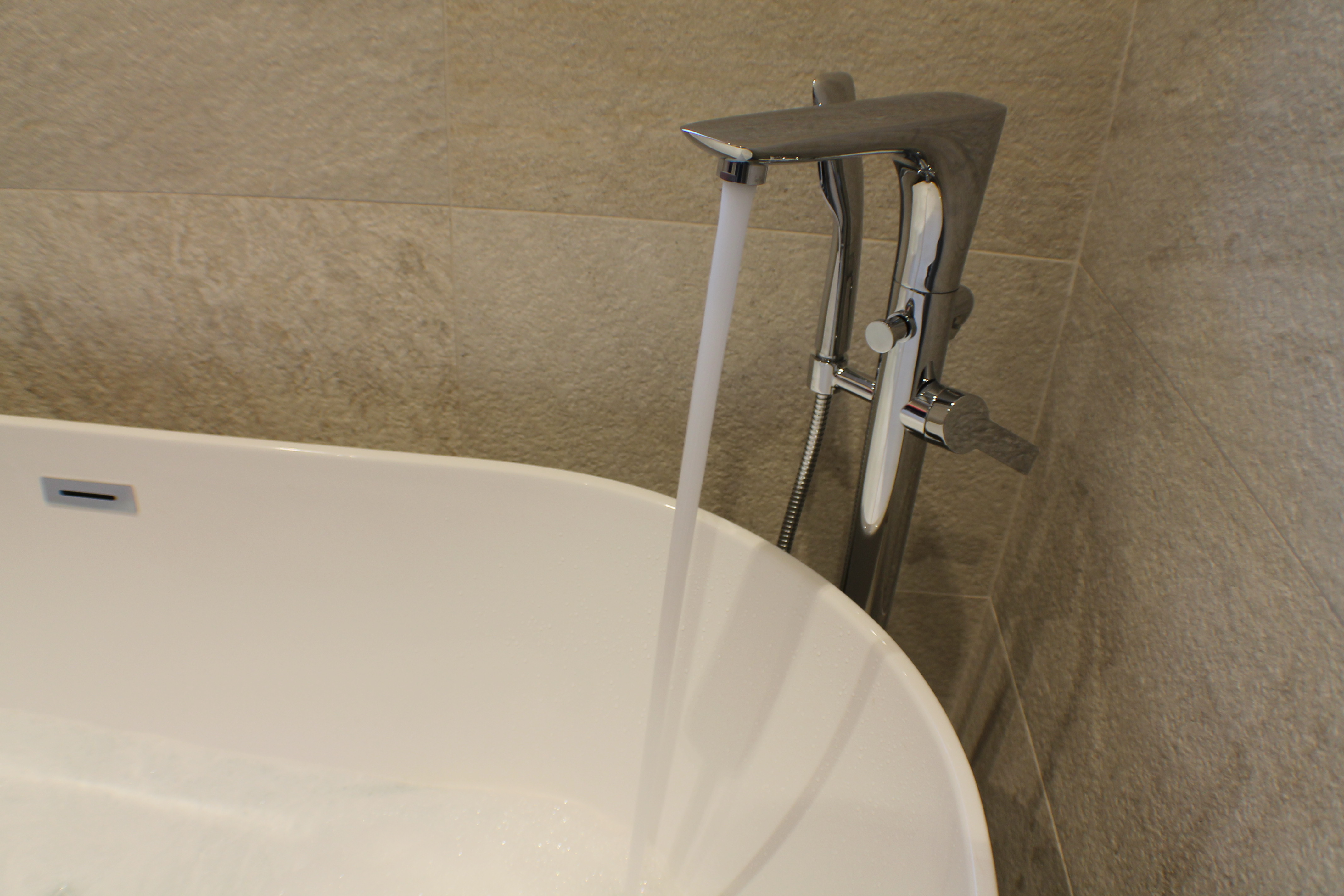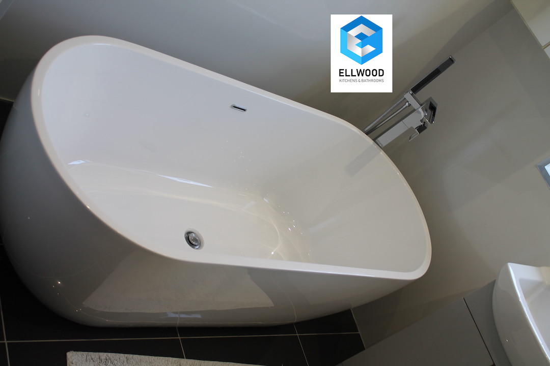 With a tiled floor, aqua pure pearl grey units, free-standing bath and square corner entry shower enclosure.