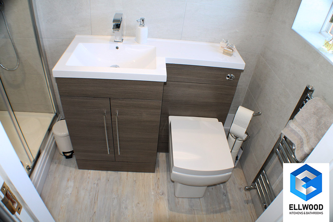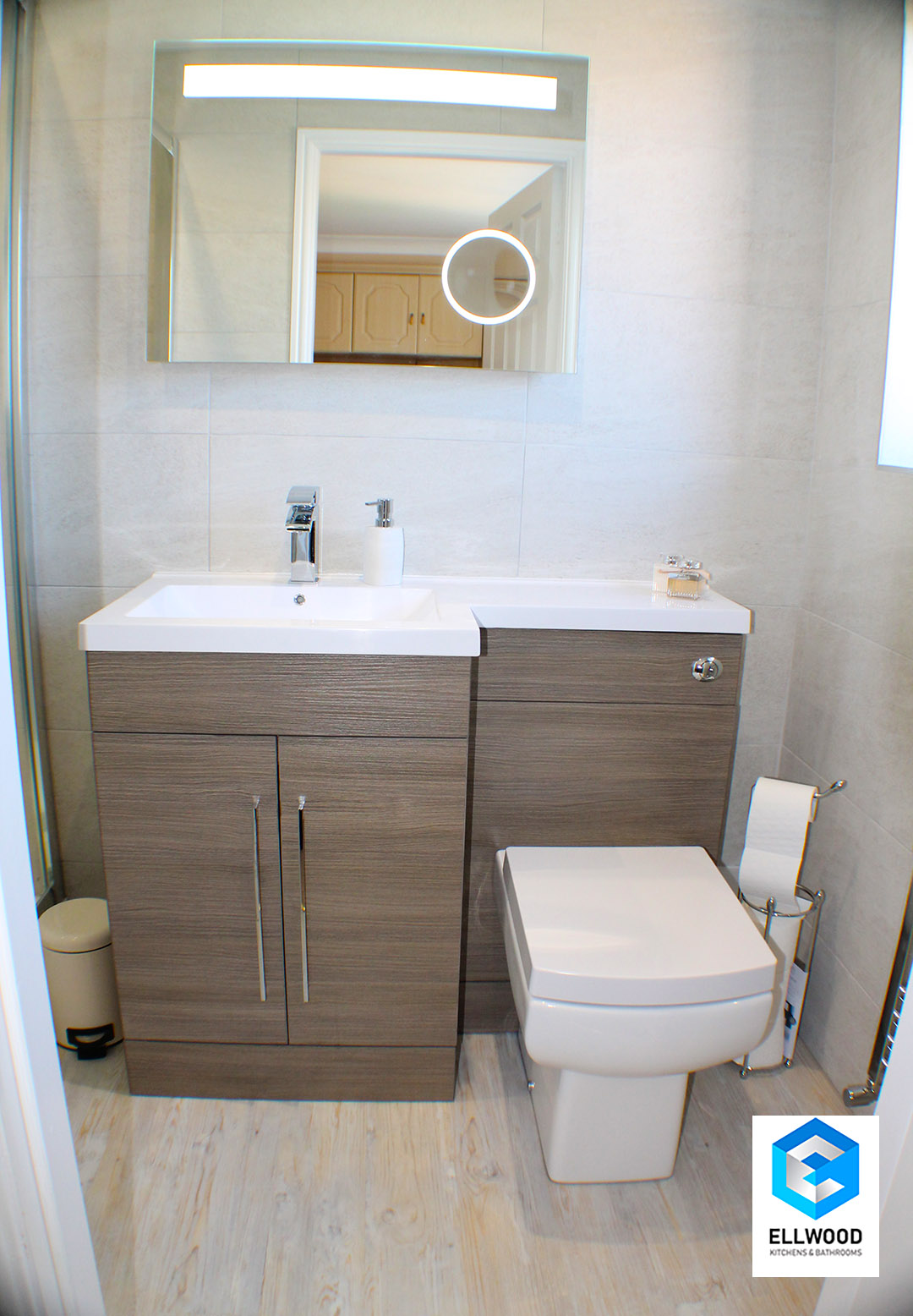 With medium oak L-shaped units, wall to wall sliding shower enclosure, grey woodgrain click-vinyl floor and led mirror.