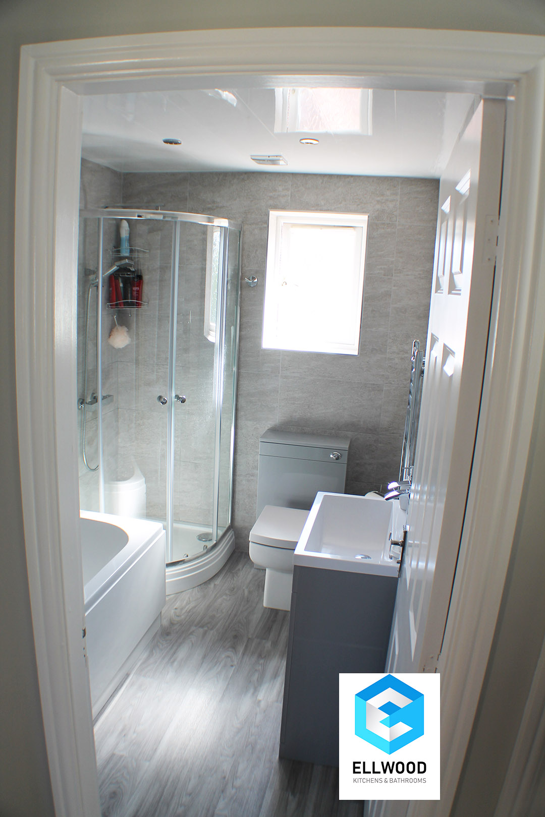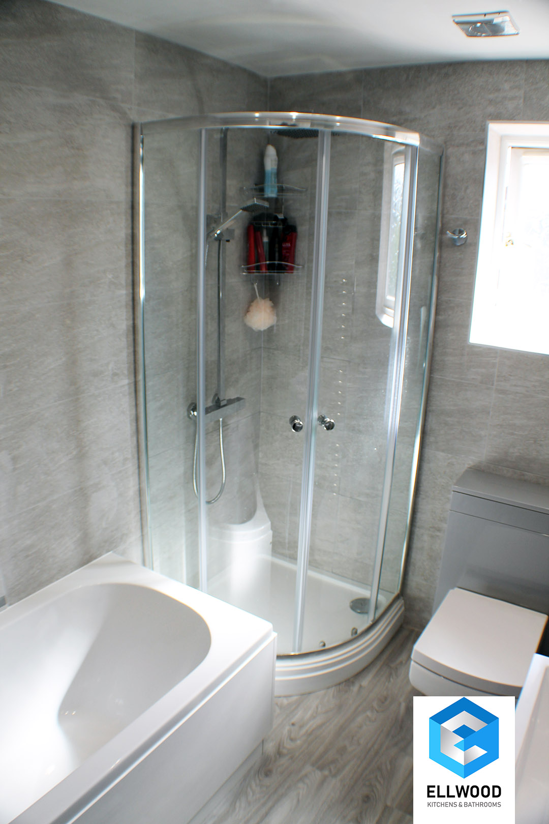 With grey idon units, 1500mm bath, quadrant shower enclosure, grey woodgrain effect click-vinyl and led mirror.