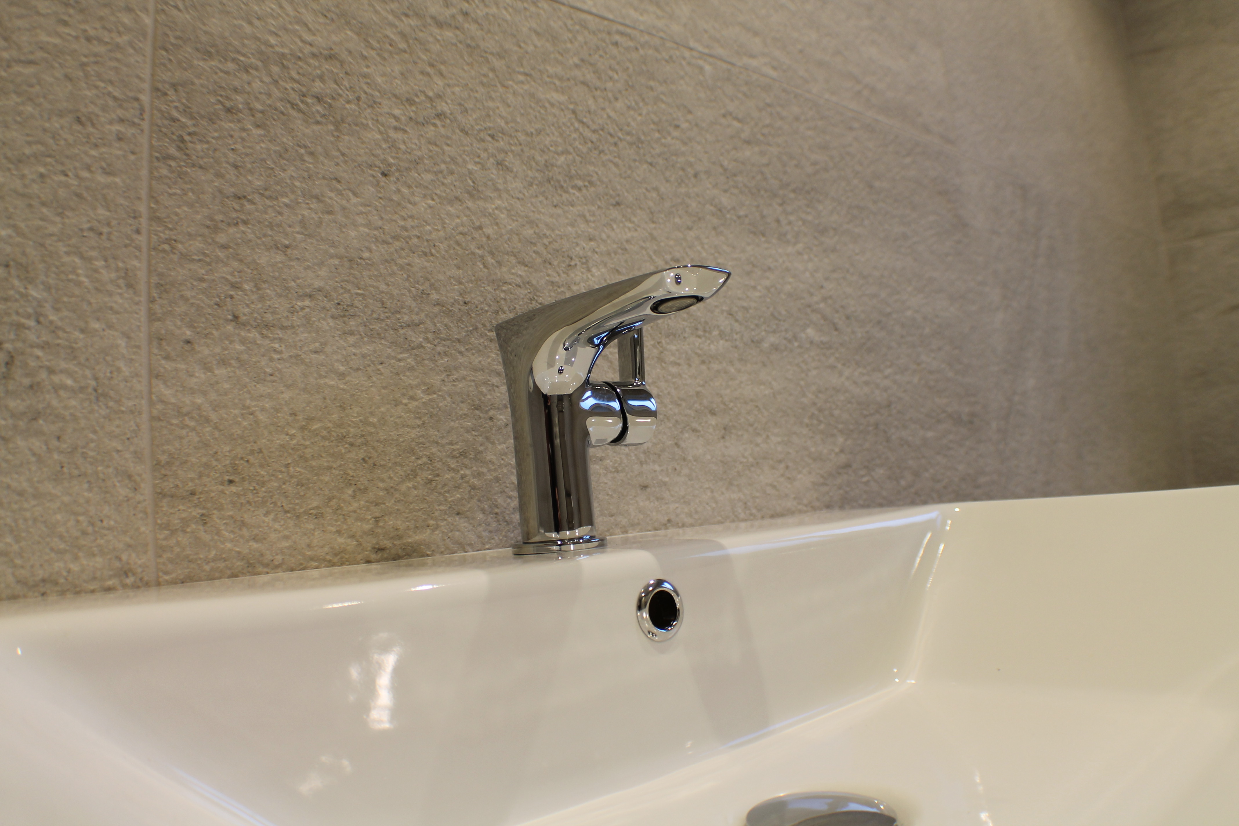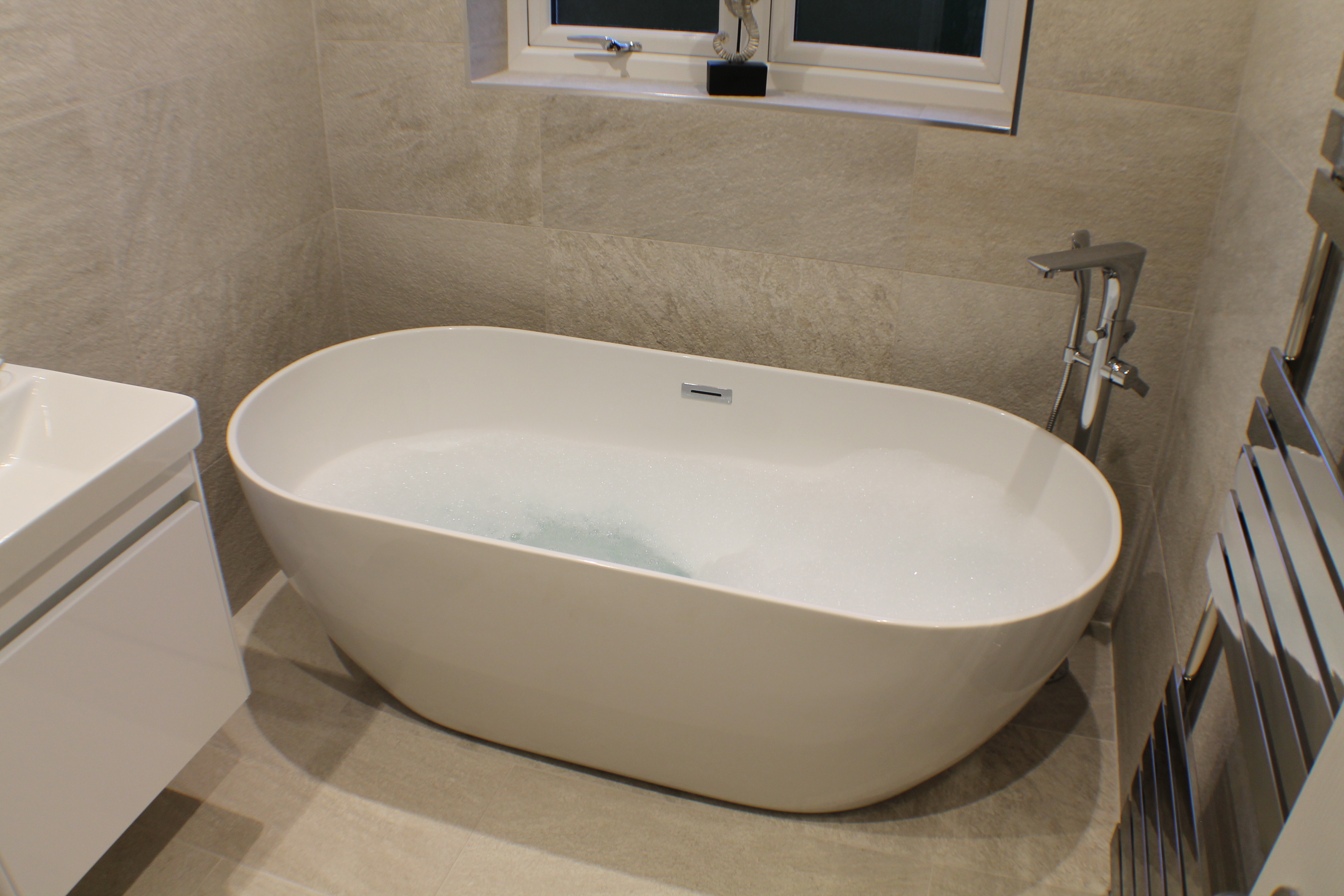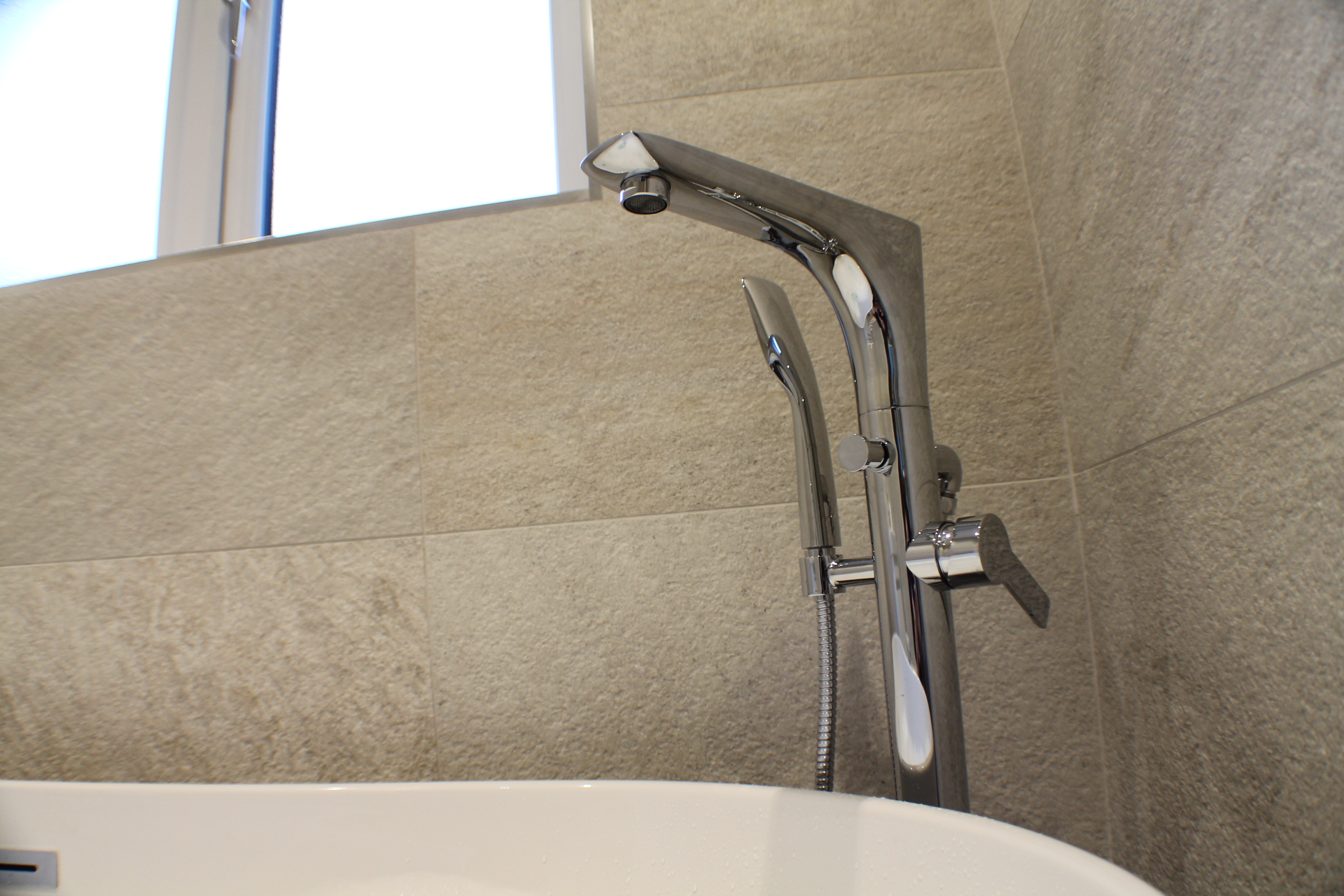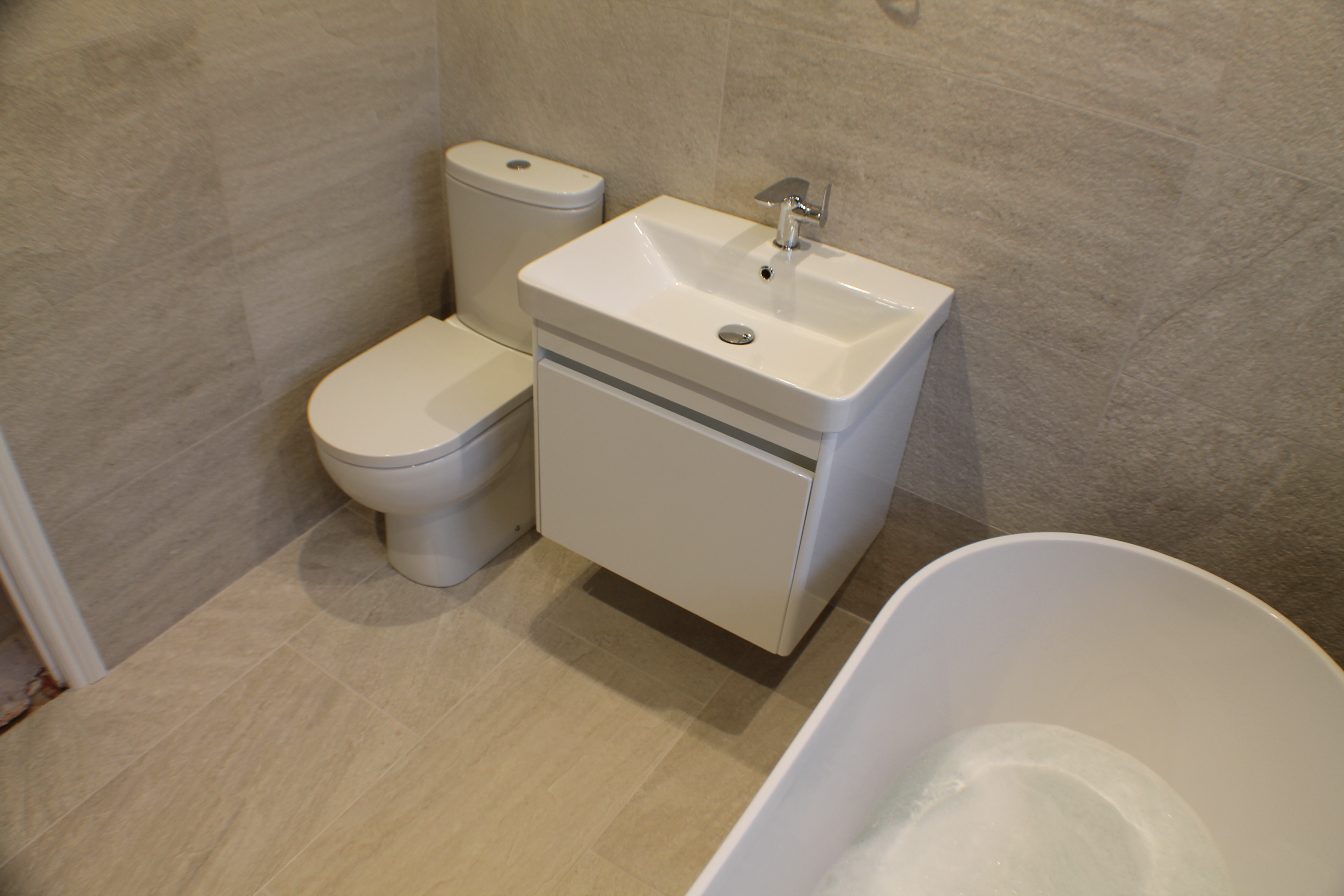The minimalistic yet warm effect given by this bathroom was achieved with a free standing bath, wall hung vanity unit and natural stone effect porcelain tiles.